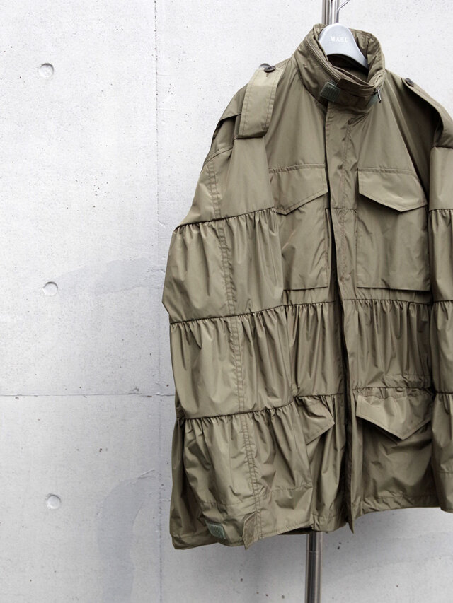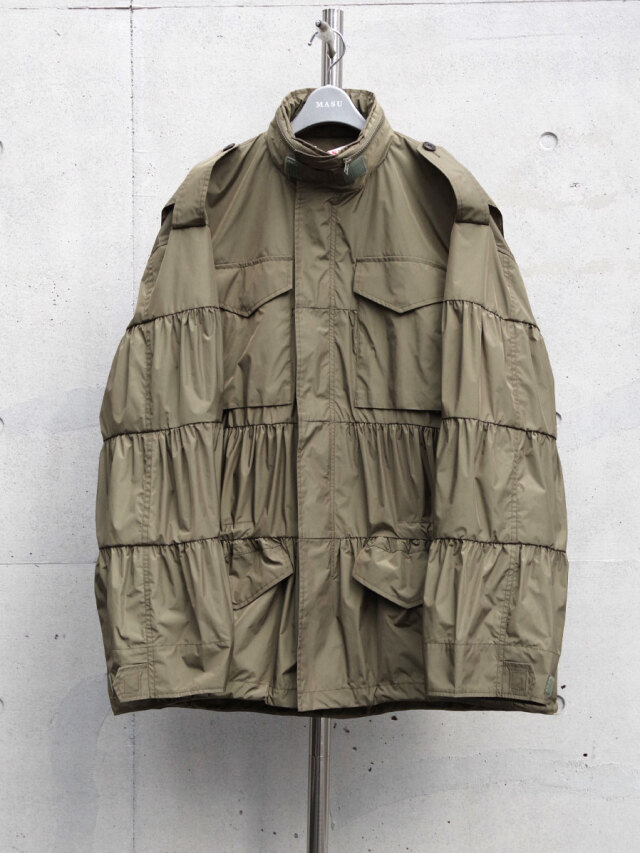 ギャザーが生む独特の動きにより、着る人の個性を引き立てるデザイン。ミリタリーのアイコニックな要素を継承しつつ、全く新しい表情へと変化させたジャケットは、クラシックとモダンが融合するMASUらしい革新的な一着です。