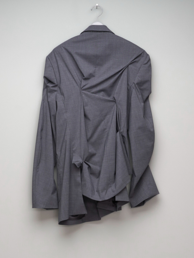 The water-repellent classic suit fabric has a unique tension, and the back is unlined for added lightness. The random tucks intentionally break the silhouette of the traditional "navy blazer", and the design that loses its original form contains an ironic question to traditional style.