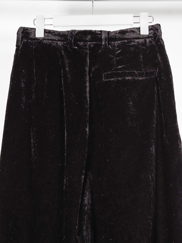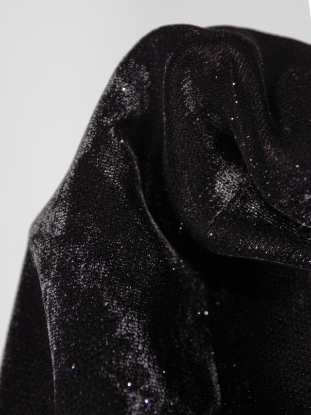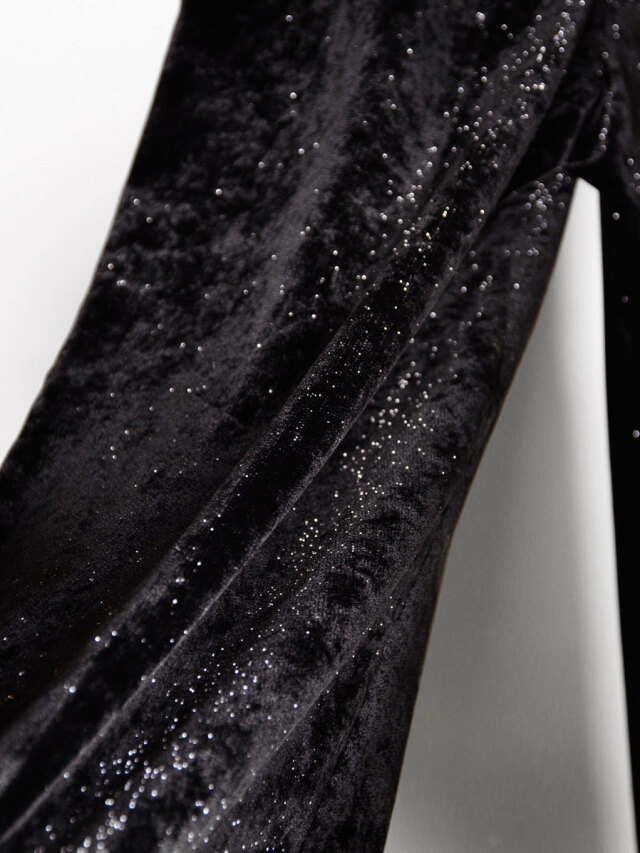 光沢のある糸が織り込まれたベルベットは、夜道の濡れたアスファルトの煌めきを想起させる。