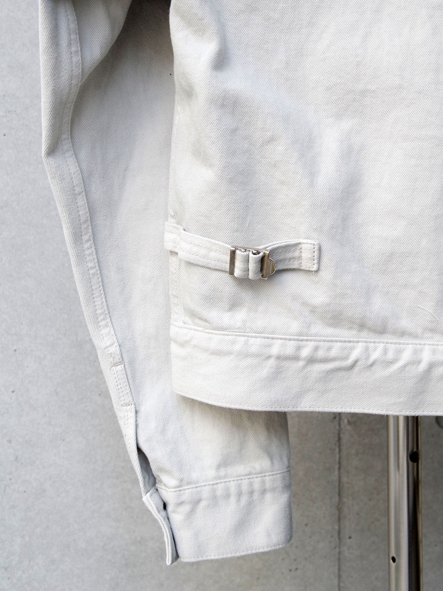 製品染めによって表現されたセメントカラーが印象的な13ozデニムを採用。適度な厚みで着用することで更に生地感が柔らかくなり、デニム特有の経年変化もお楽しみいただけます。少し暖かい時期にはシャツとしての使い方で袖を捲ったり、タンクトップやTシャツをインナーに合わせたコーディネートも。秋冬にはインナー使いとしてフロントのデザインを覗かせたアウターonアウターもオススメです。