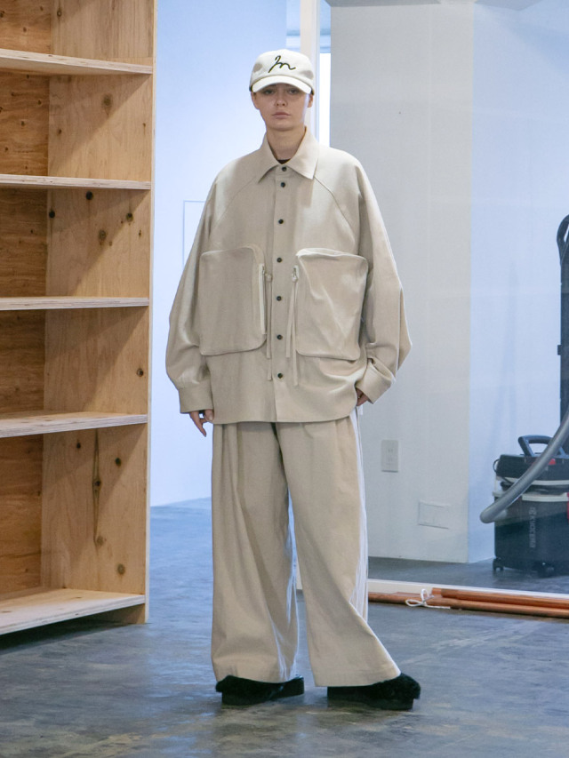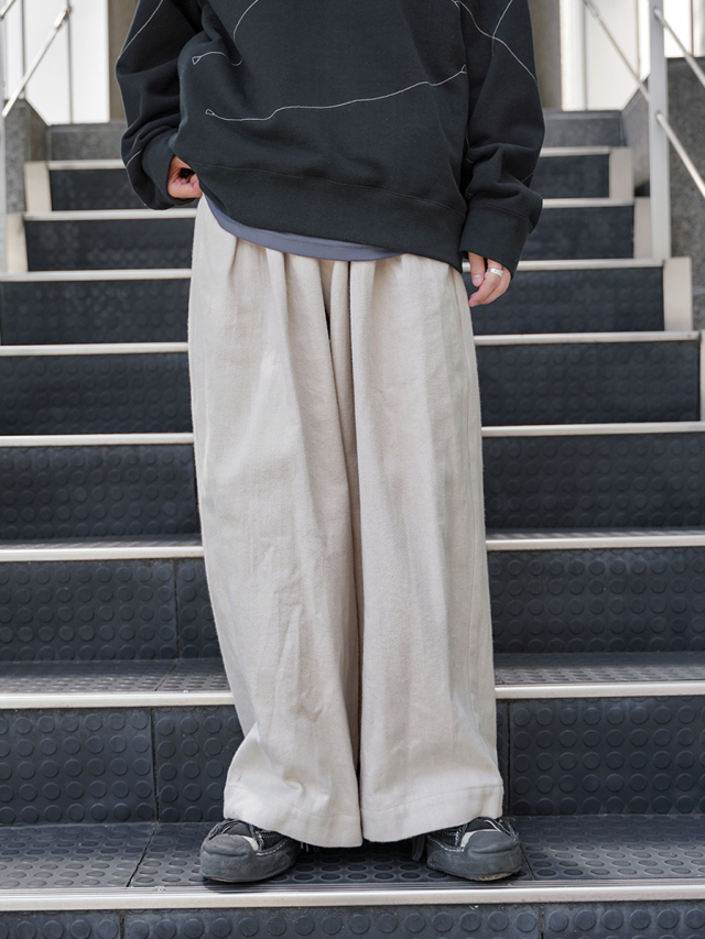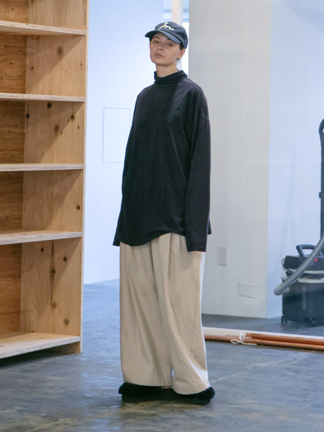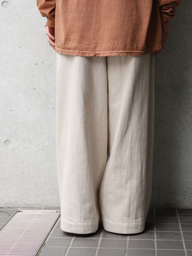 腰回りに2タックを設け、しっかりと太さのあるワイドシルエットに設定。生地の柔らかさで陰影のある縦への落ち感も生まれ、より雰囲気が演出されています。