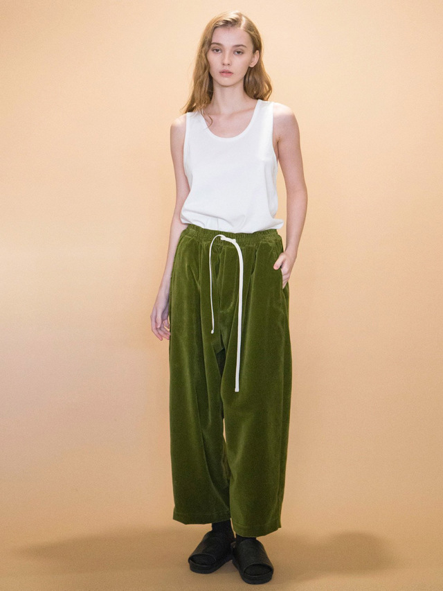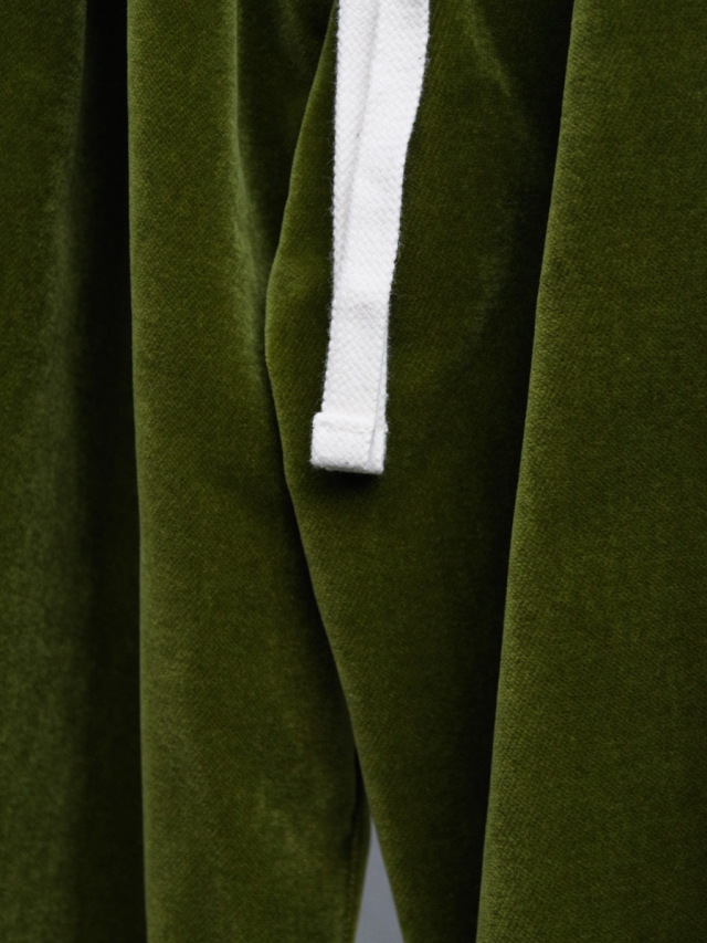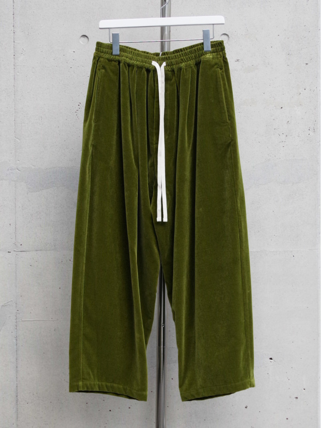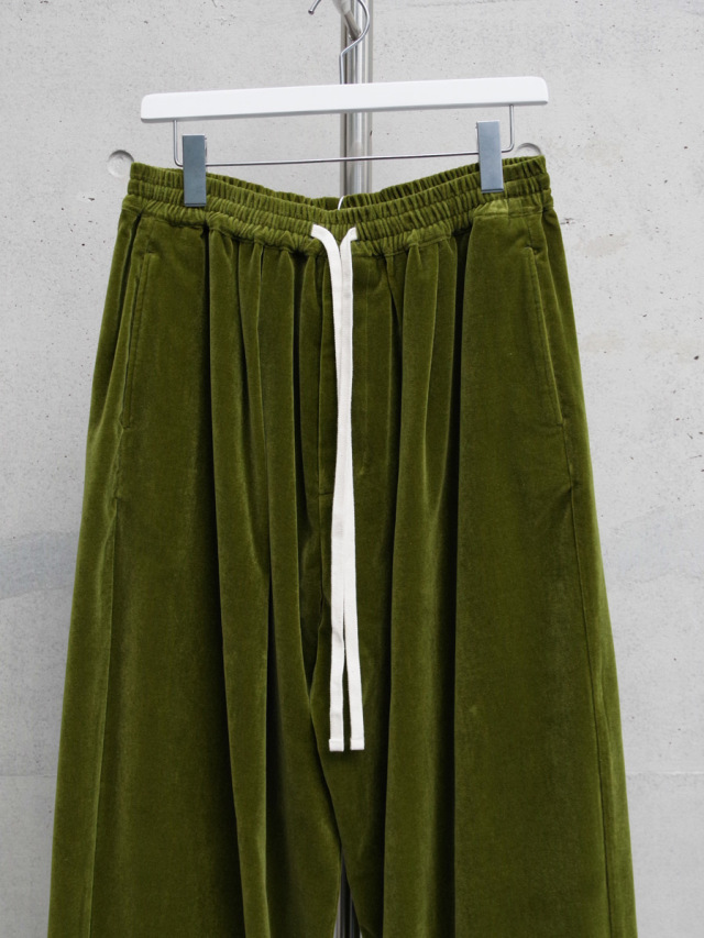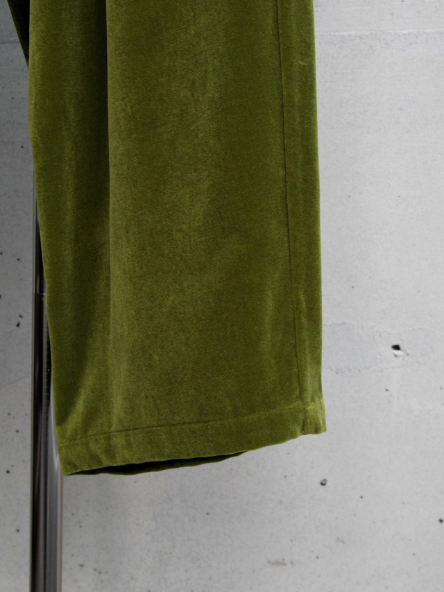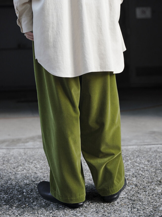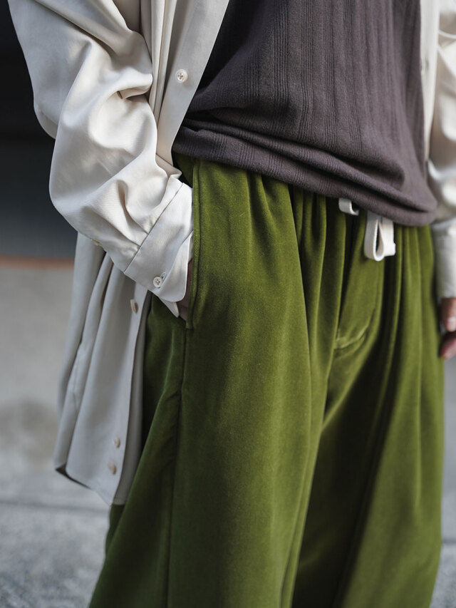 経糸にコットン、緯糸にレーヨン、パイル糸を使用したベルベット生地を採用したワイドパンツ。