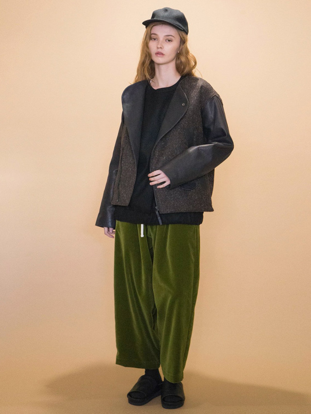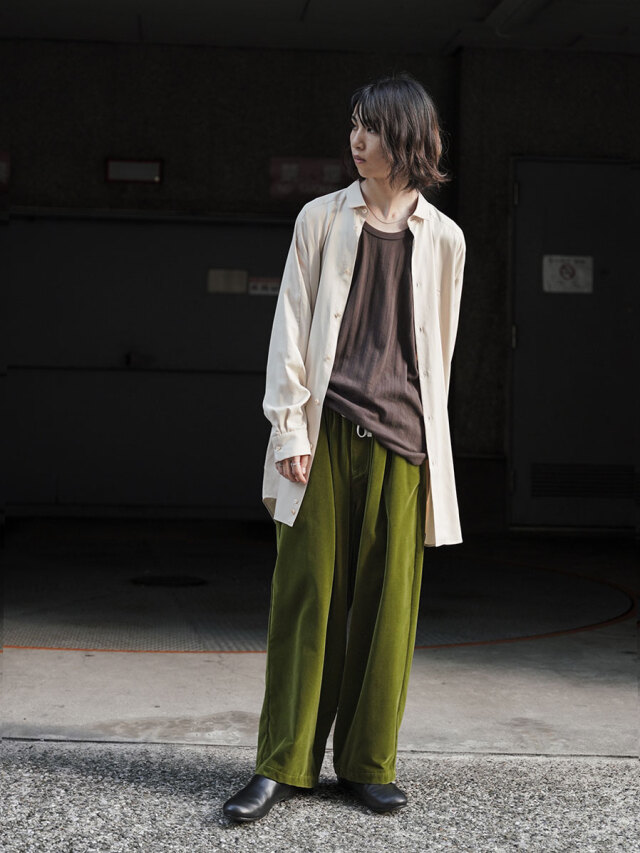 艶のあるベルベットの質感とワイドなシルエットで程よい存在感とインパクトをスタイリングにプラス。シンプルなスタイルもバランス良く仕上がります。