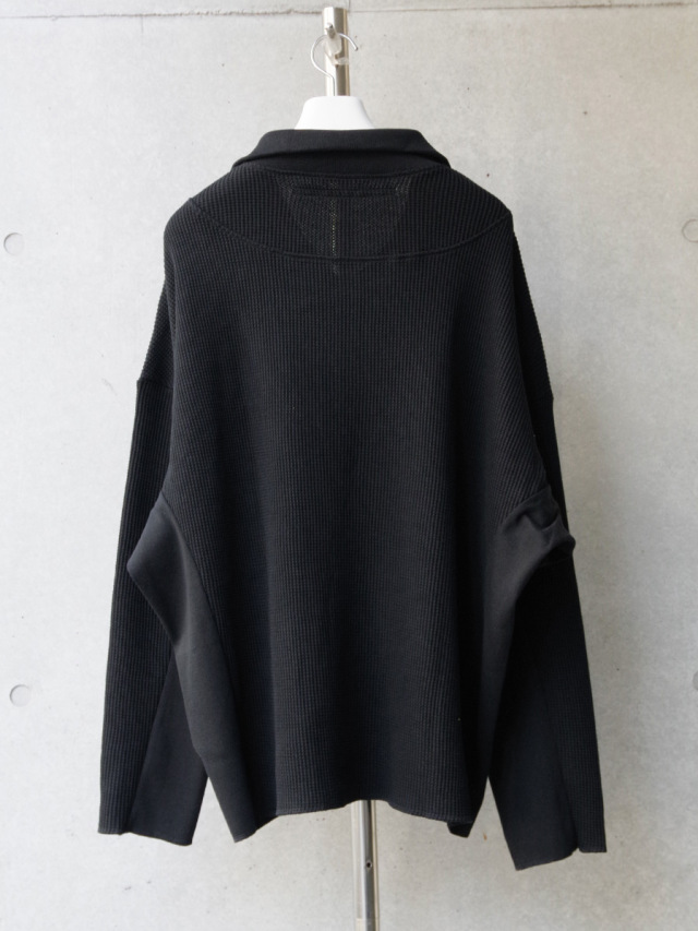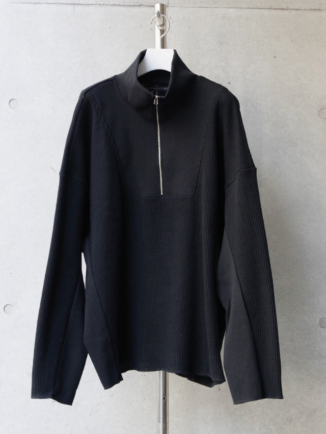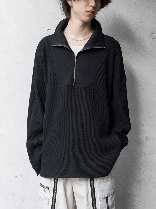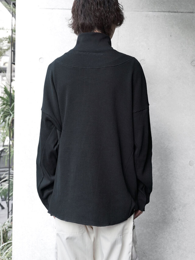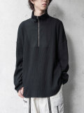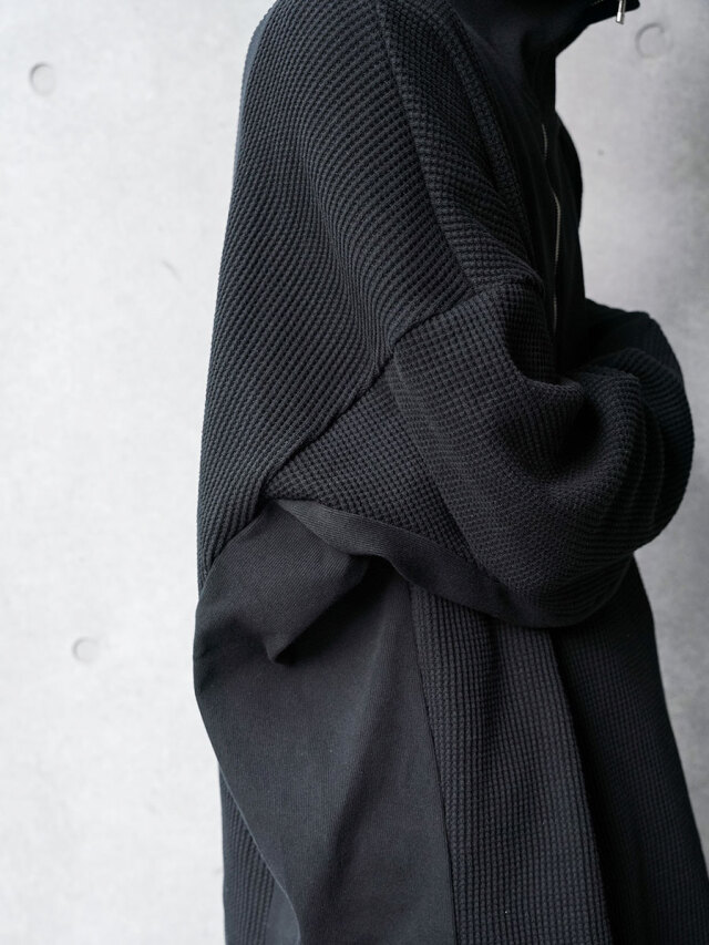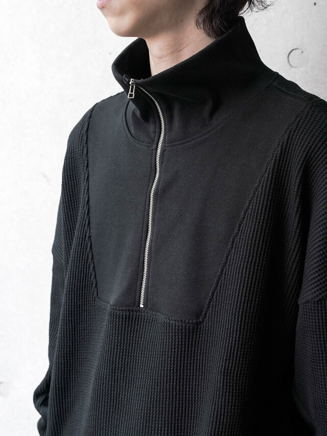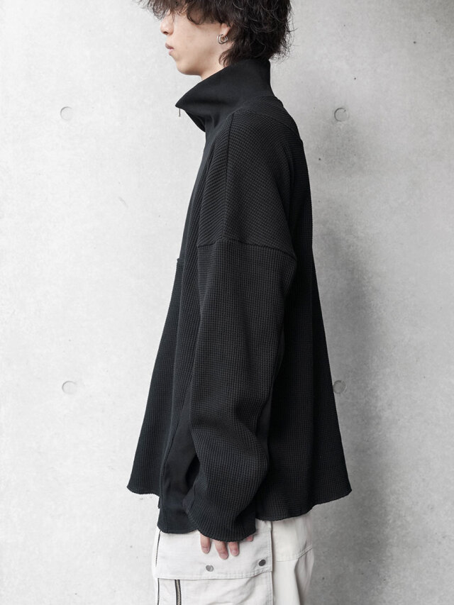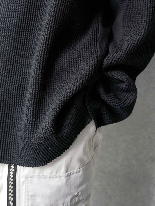 シャリ感がありドライな質感ながらもくったりとした柔らかさを感じさせるワッフル素材で製作されたアイテム。ジップアップのハイネックデザインは、上まで閉じてシャープなラインを楽しんだり、少し開けて襟を横に開いたりとコーディネートに応じて様々なアレンジが楽しめます。
