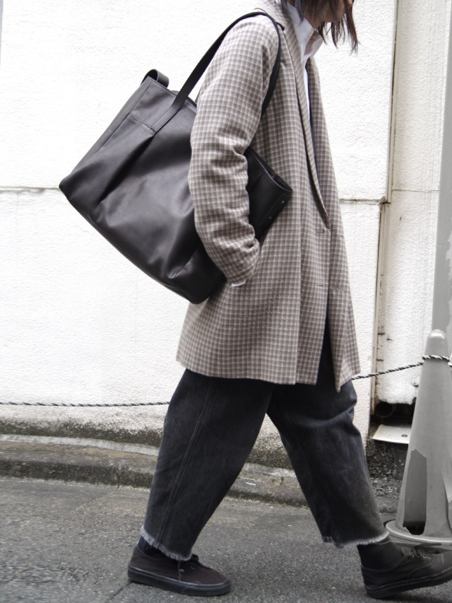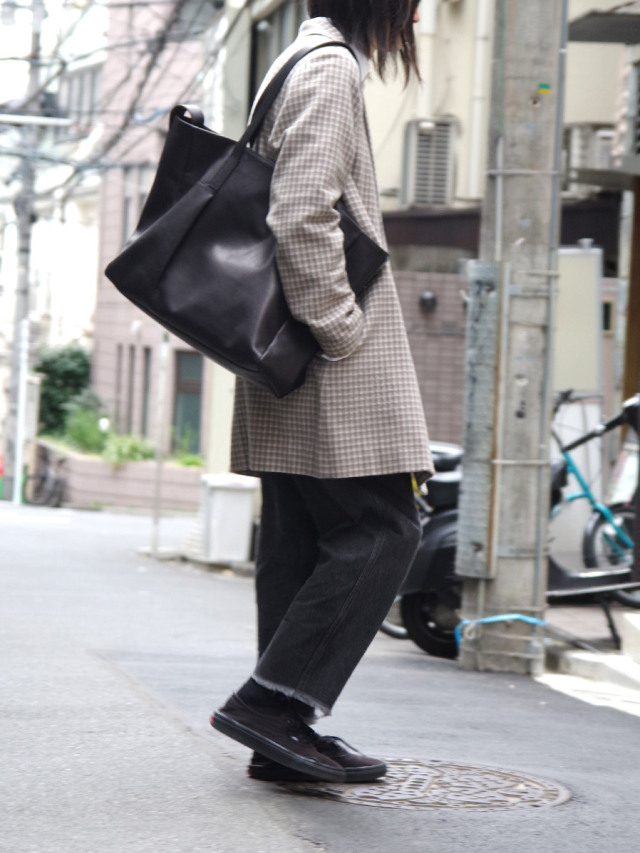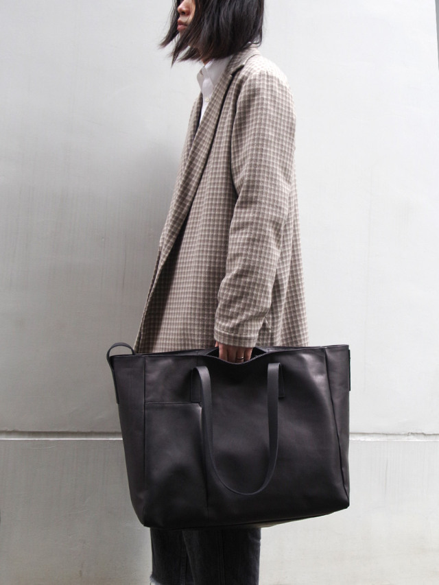 幅、深さ、マチをそれぞれたっぷりとったボリュームあるトートバッグ。 前面には縦切替の横入れポケット、背面にはシンプルなスリットポケットを配備し、内側にはドットボタン開閉のポケットとファスナー開閉のポケットを採用。収納面にもこだわることで使い勝手の良い仕上がりに。