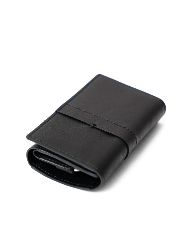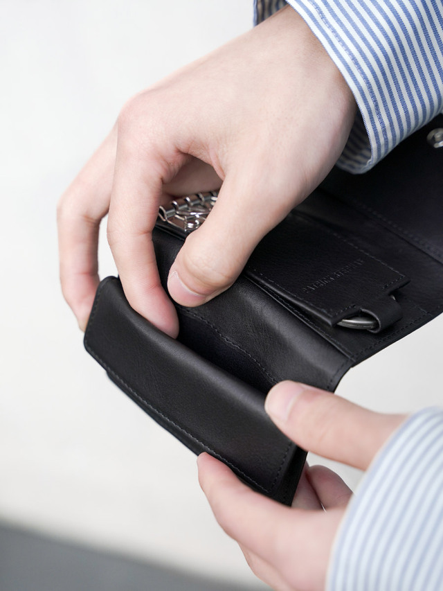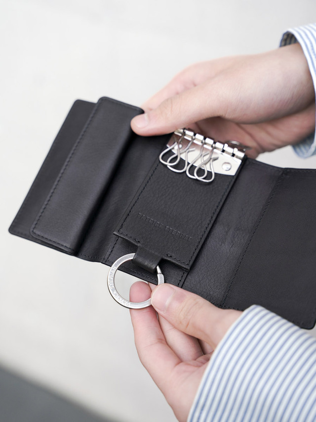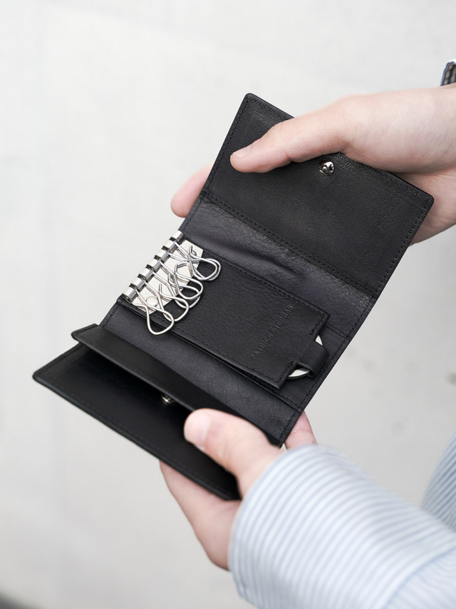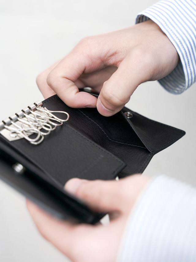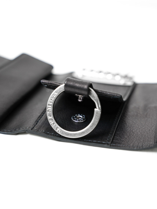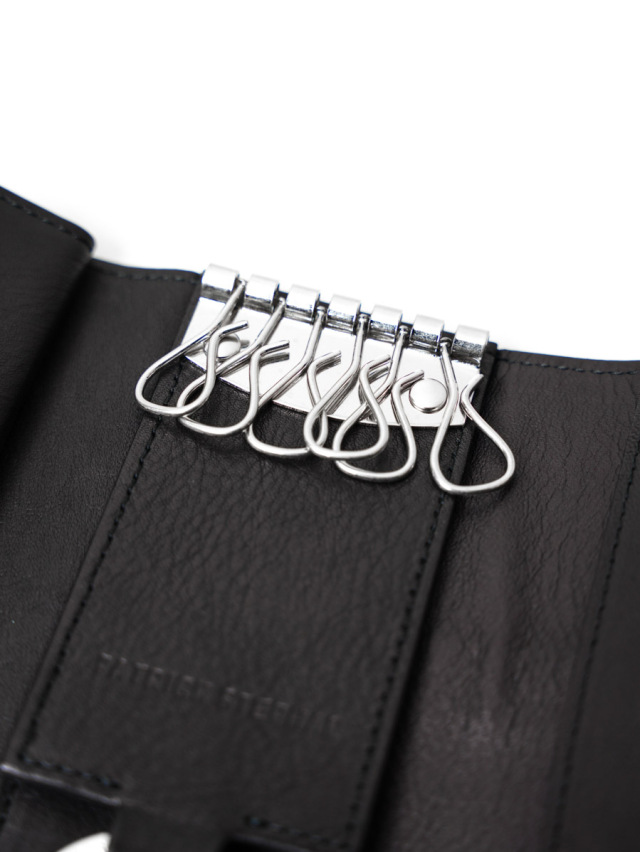ホック留めポケットx1、カード入れx2、キーホックx5、便利な二重リングを装備したキーケース。