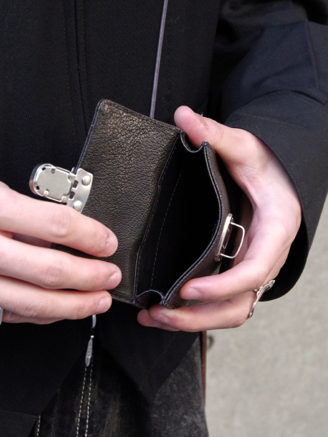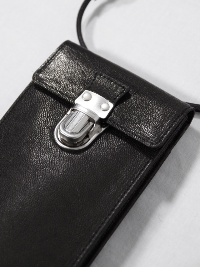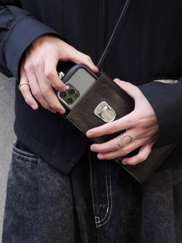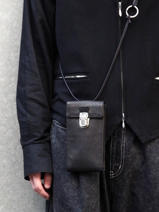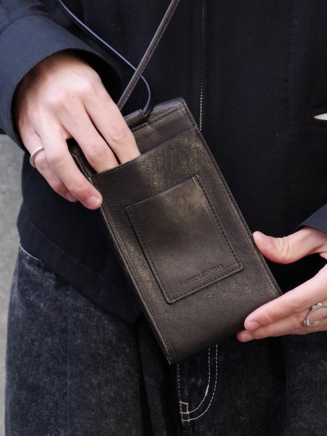 スマートフォンを持ち歩くのにちょうど良く設計されたサコッシュ タイプのバッグ。フロントメインポケットは差込み錠で開閉する仕様で、後ろ側には2箇所のスリットを配備。これによりモバイルバッテリーなどを持ち歩いている際はそのままスマートフォンを充電することも可能です。