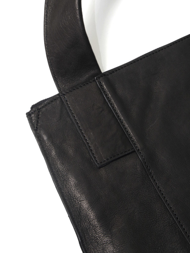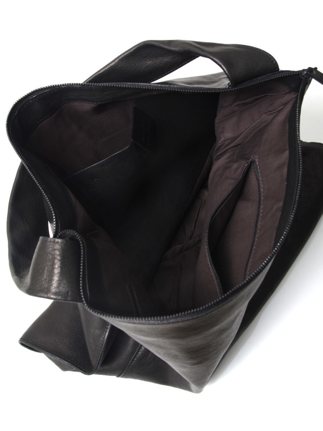 上部はファスナー開閉仕様で、内側には縫いつけのレザーポケットを備えています。収納力にも文句なしのアイテム◎