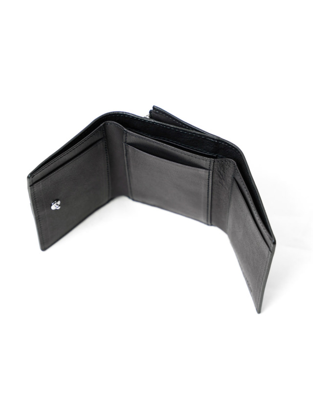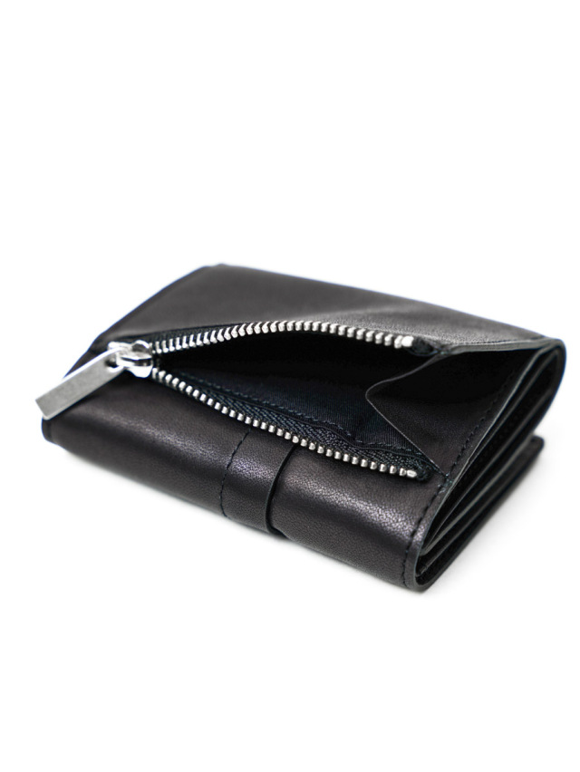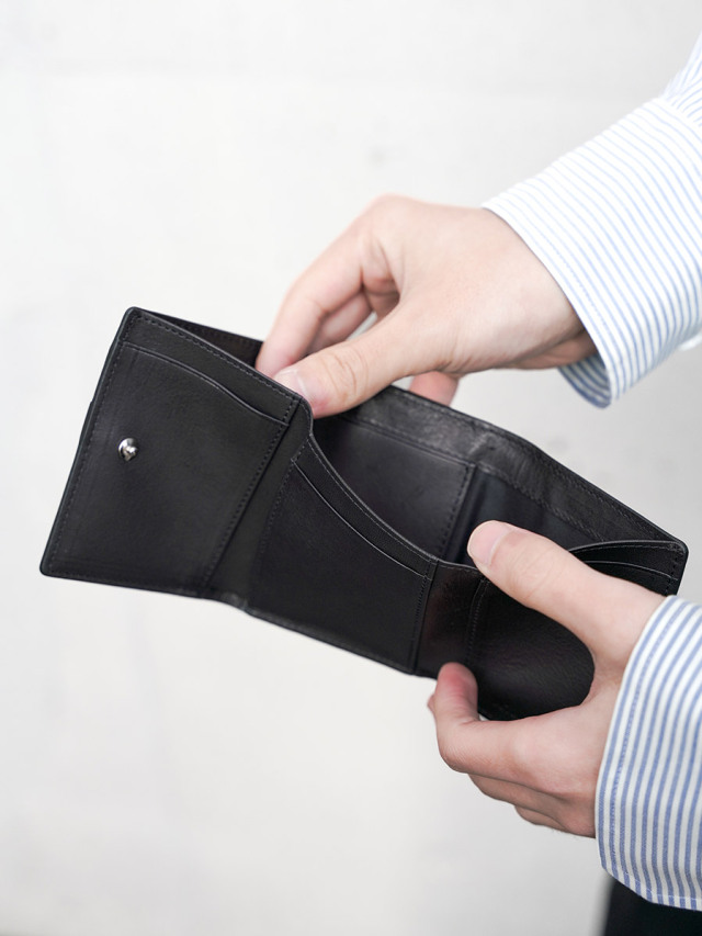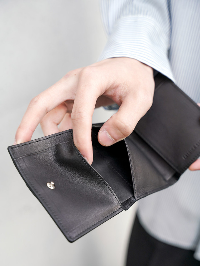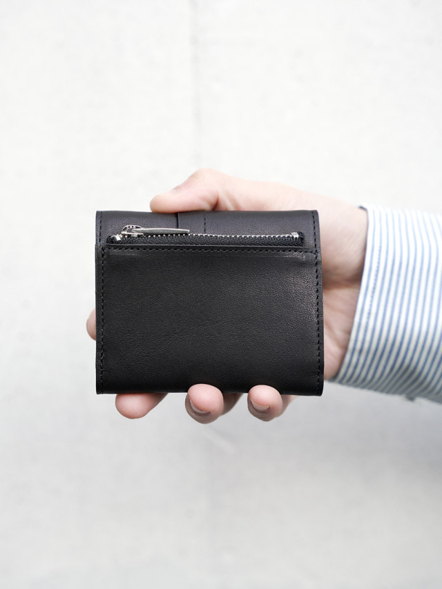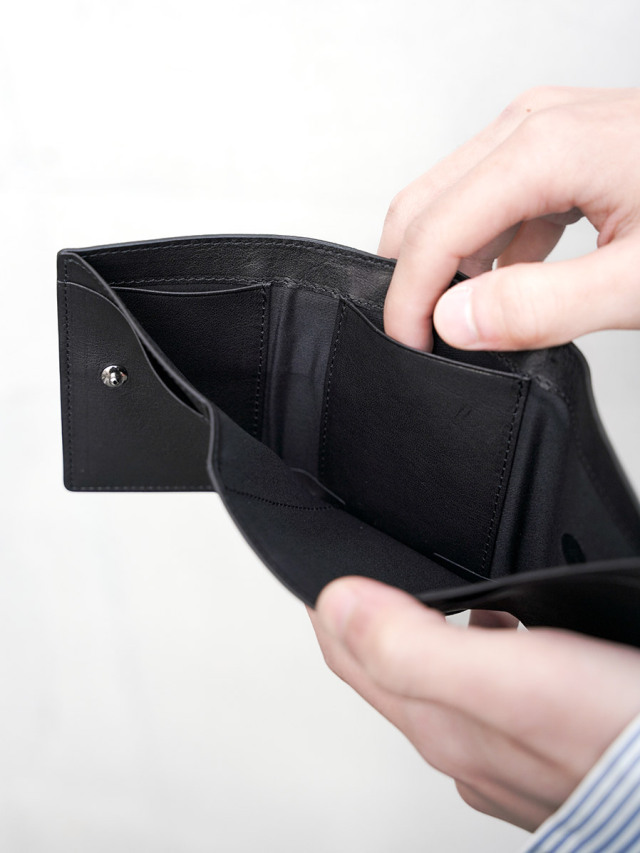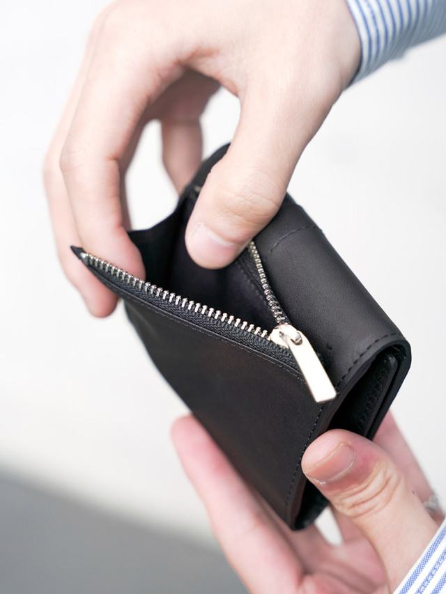 小銭入れx1、カード入れx7、紙幣は折らずに収納可能な3つ折りタイプのウォレット。