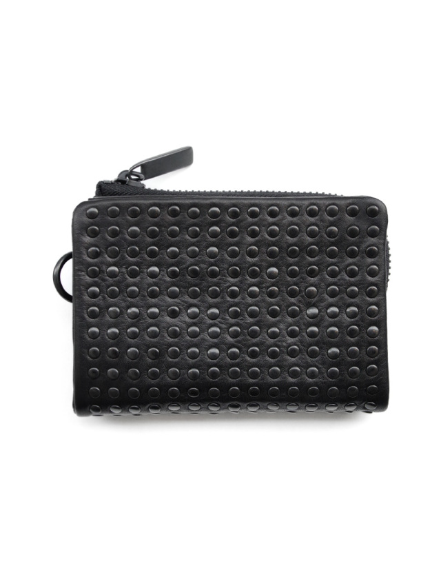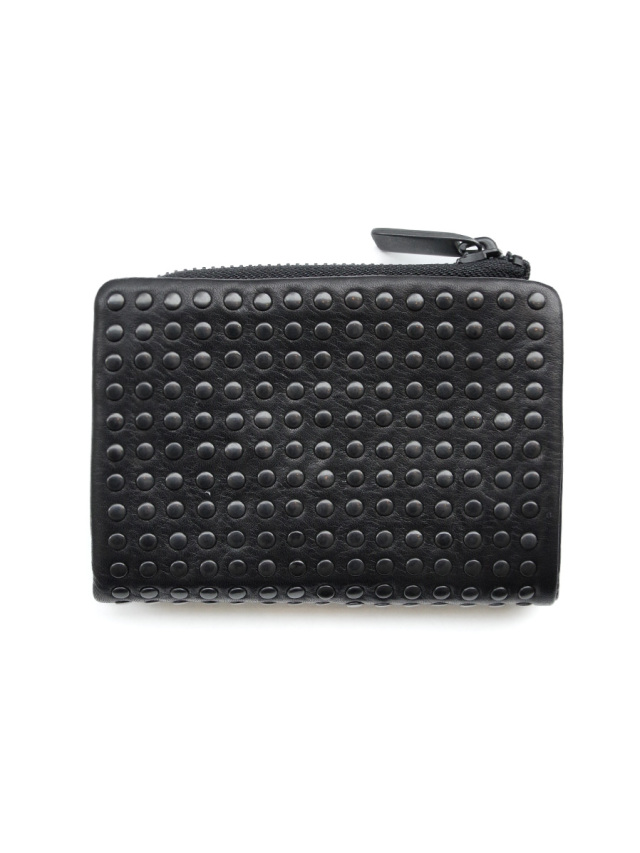 全面に丸スタッズを手作業で打ち付けた、高い職人技が光る贅沢な仕上がりのウォレット。素材には手馴染みの良い上質なカウレザーを採用し、2つ折りタイプで使い勝手の良さが魅力です。