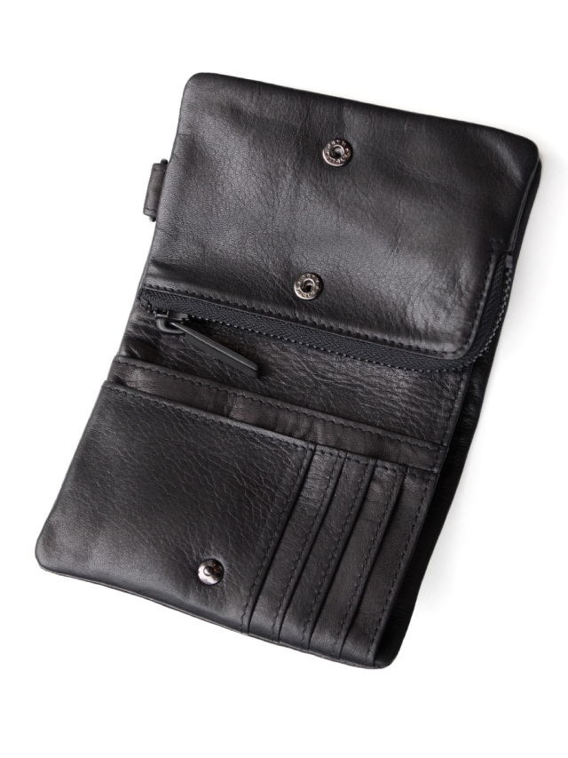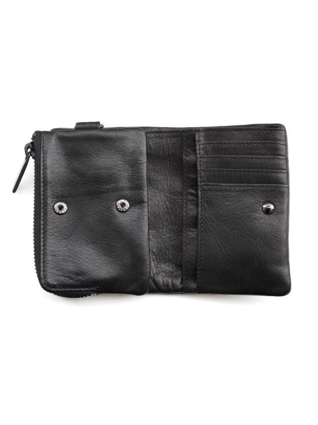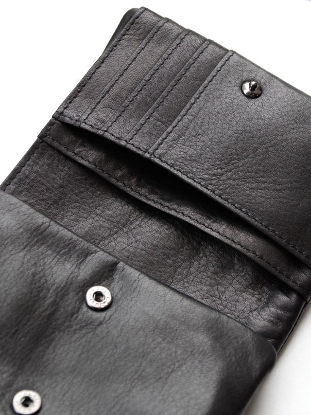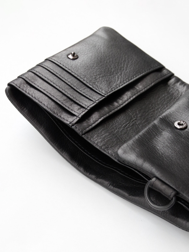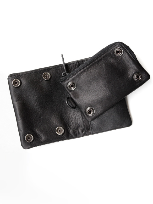 取り出しやすいファスナーがL型になったコインケースは、スナップボタンで脱着出来るので単体としても使えます。ファスナー側を内側にして使用する事もでき、自分好みにカスタマイズできるのが嬉しいポイント。機能性、デザイン、品質共に高い完成度で製作された一品です。