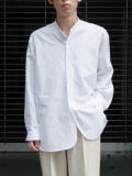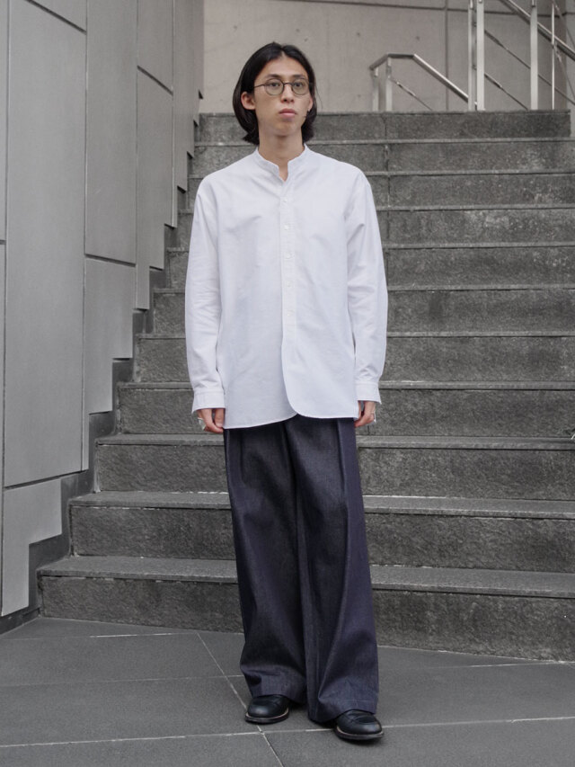 シルエットは身幅にゆとりを持たせ、やや着丈を長く残したリラックスシルエット。ヴィンテージに見られるディテールであるフロント前立ての仕様には、流れるようなカーブを描かせ美しいラインを表現しています。抜け感が生まれるようにセンターバックの高さを低くした台襟など、緻密なサイズバランスにより設計された一着。タックインスタイルはもちろん、前開きで羽織ったカジュアルなスタイルにもおすすめです。