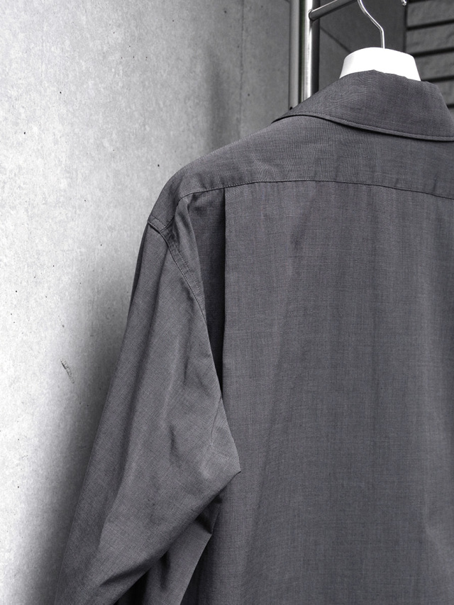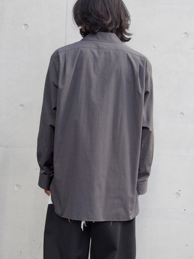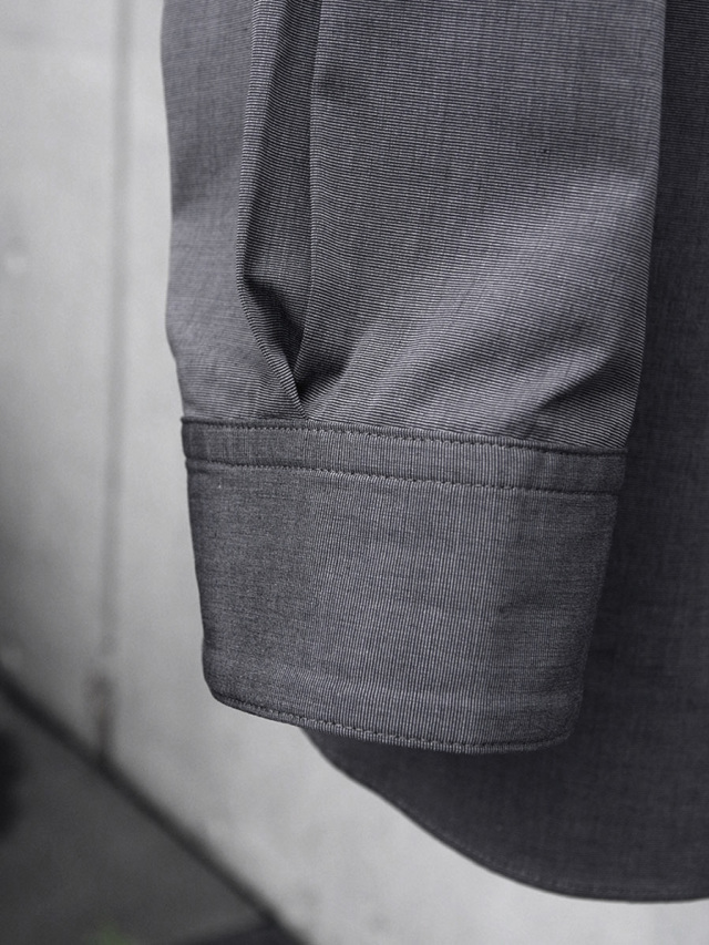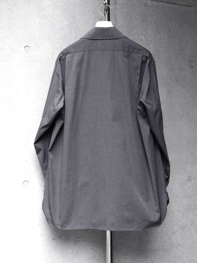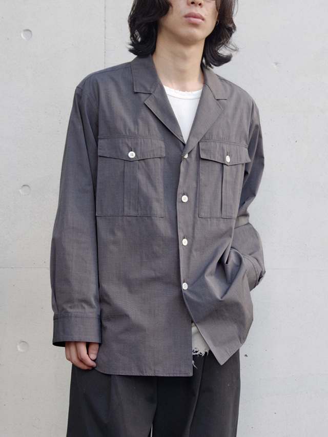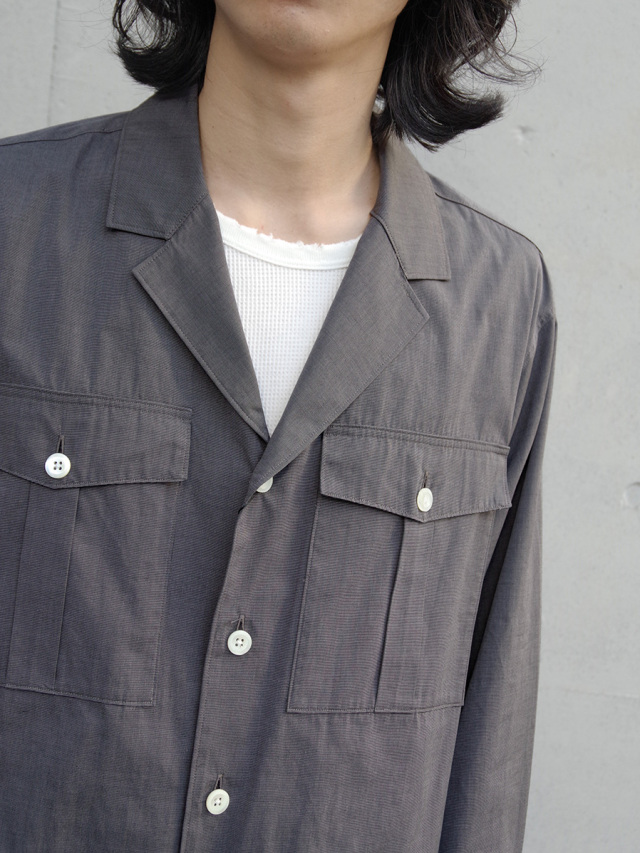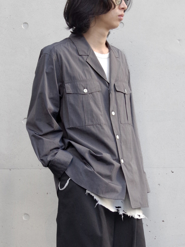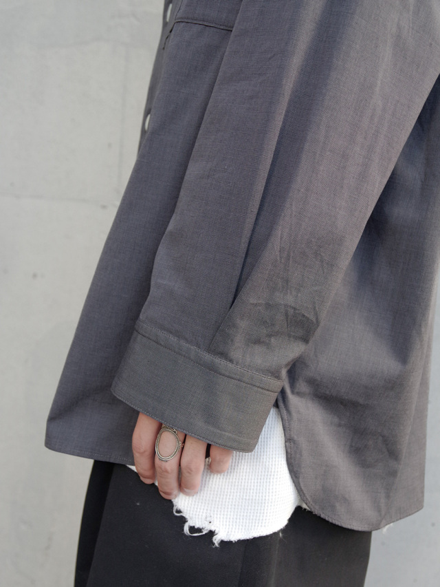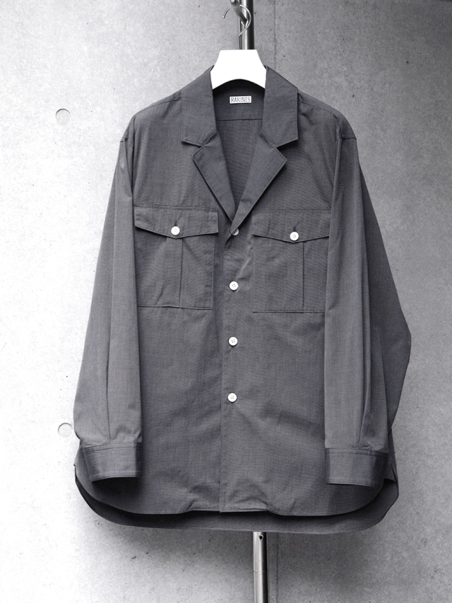 首元のノッチドラペルによってジャケットのような風格を漂わせ、大人のムードを感じさせる仕上がりに。アームにややゆとりをもたせシルエットはアウターのような雰囲気も備え、ワークジャケットとドレスシャツの要素を併せ持ったようなオリジナリティある存在感を醸し出しています。