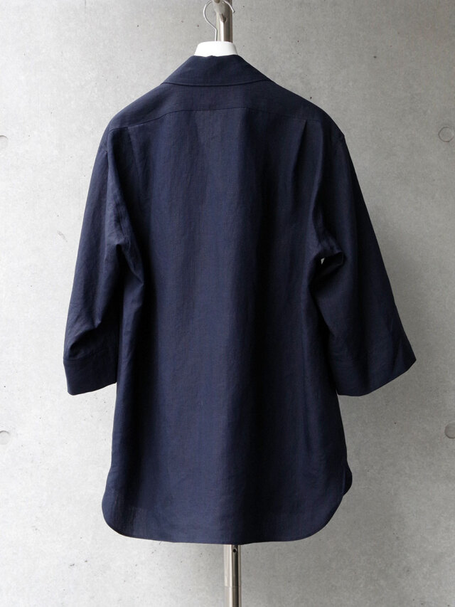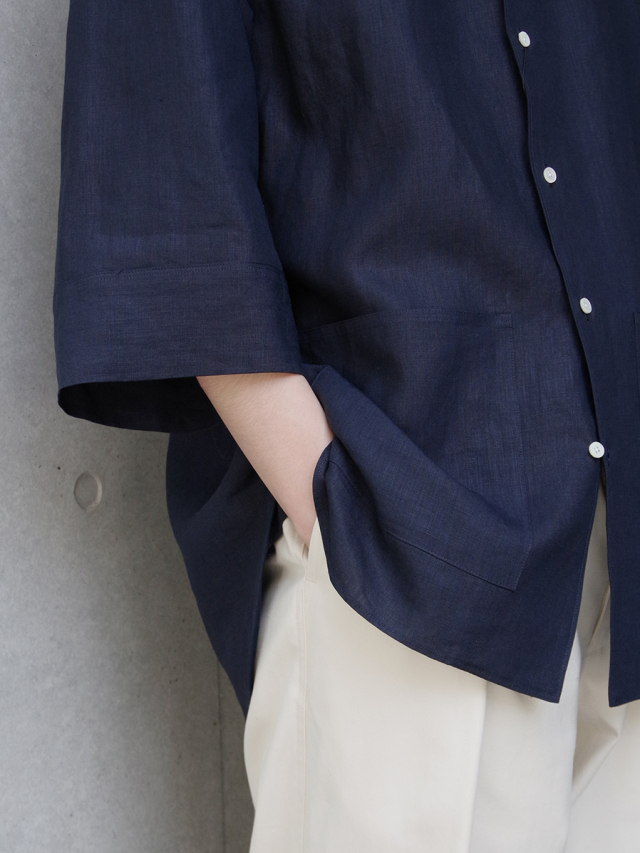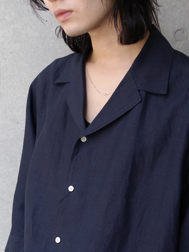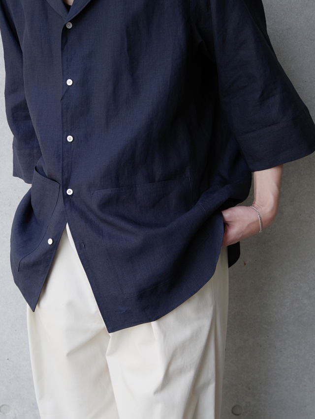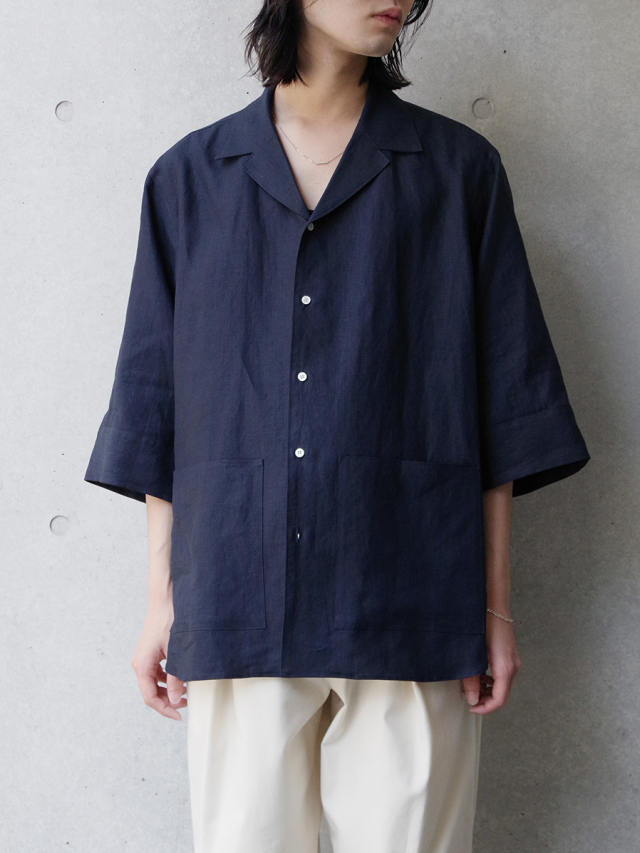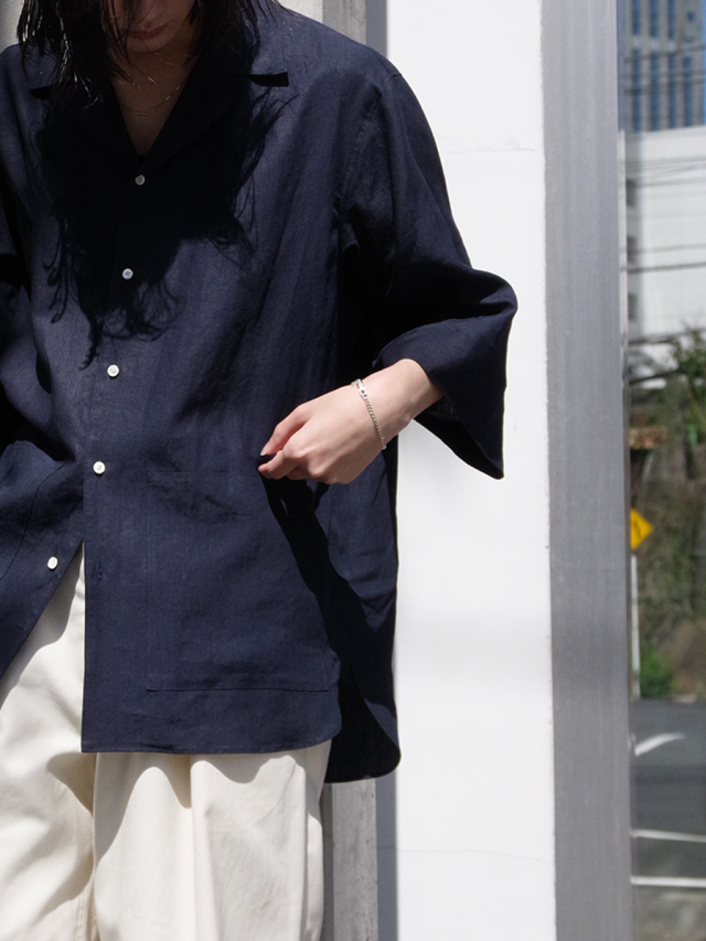 ヨーロッパのヴィンテージウェアにみられる高密度のリネンポプリン素材を採用したオープンカラーシャツ。