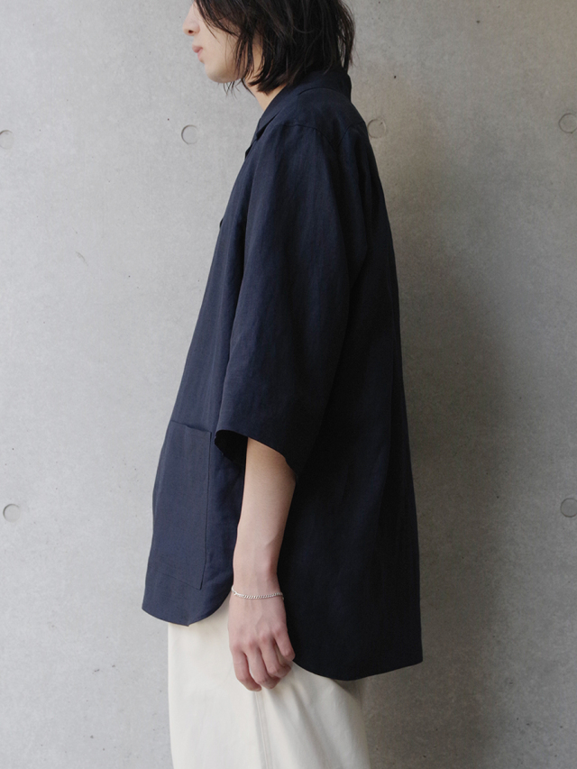 ミニマルな印象の中にも両腰に設けられたパッチポケットがアクセントになり、機能面も向上。着丈には前後差を出しシルエットでも遊びを加えています。抜群の清涼感と相まって、季節感を押し出した爽やかなコーディネートを演出してくれるアイテムです。
