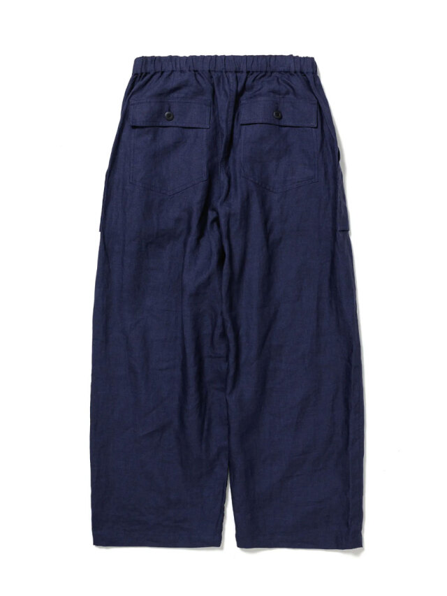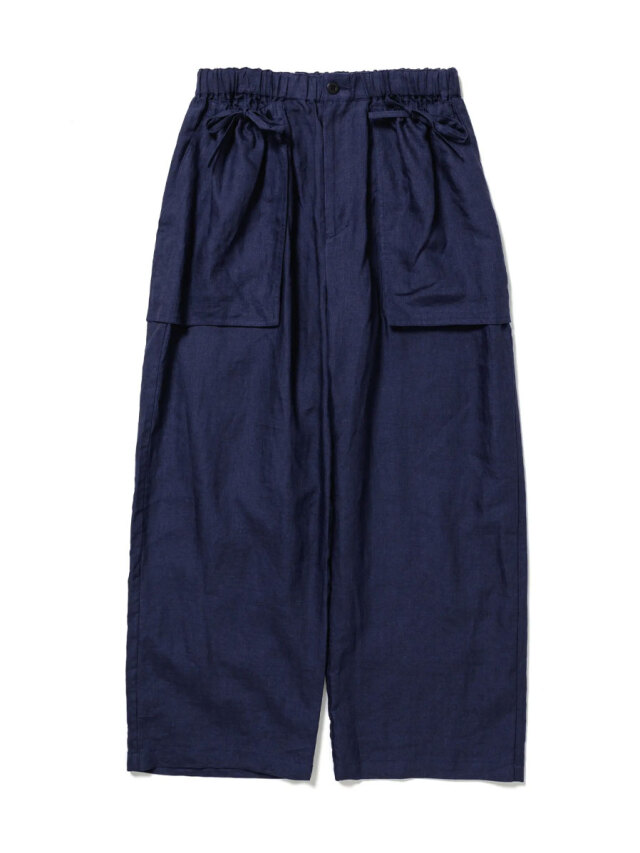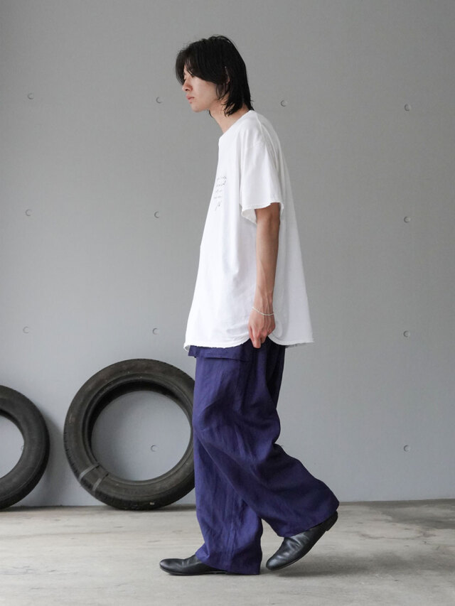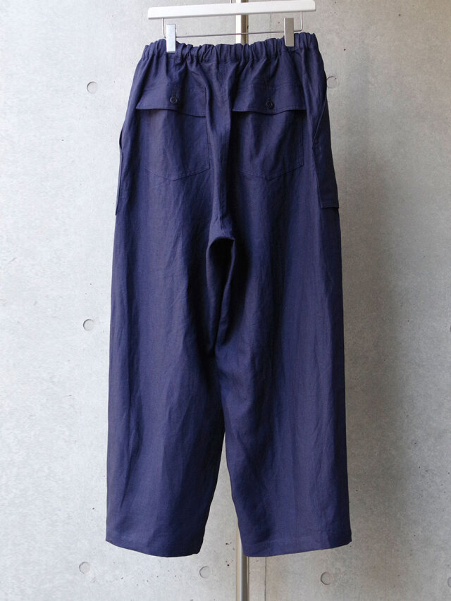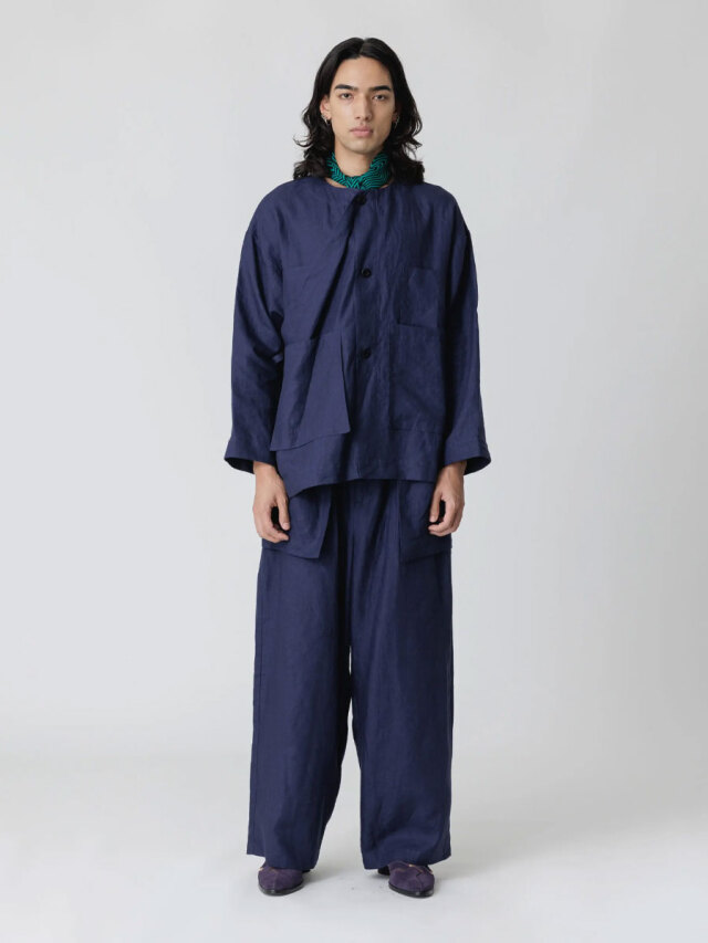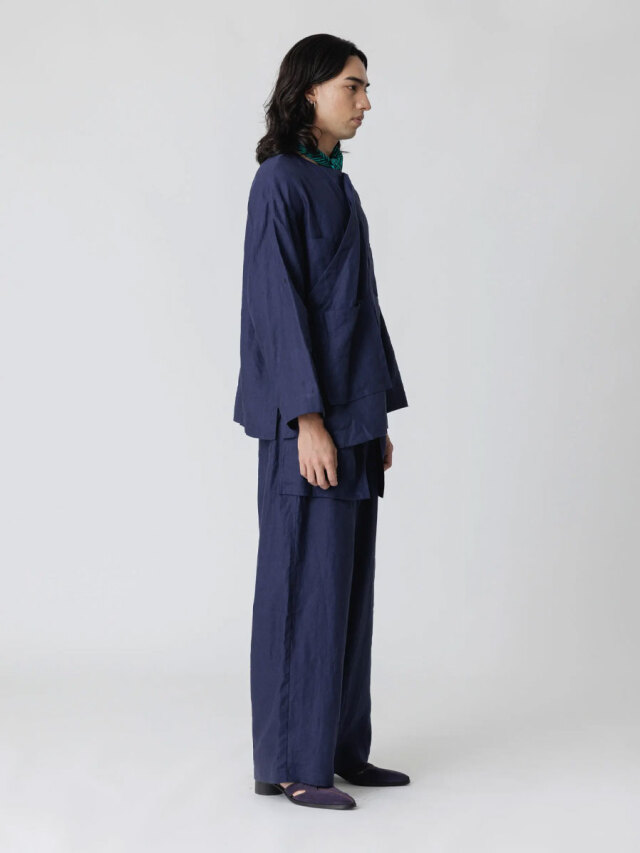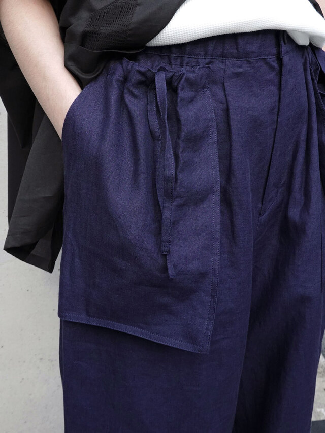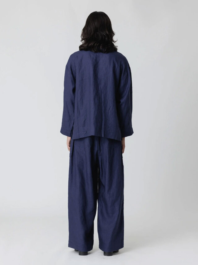 生地にはインディゴ染めを施したリネン素材を使用。天然素材ならではの風合いと軽やかな着心地が魅力で、使い込むほどに味わいが増します。