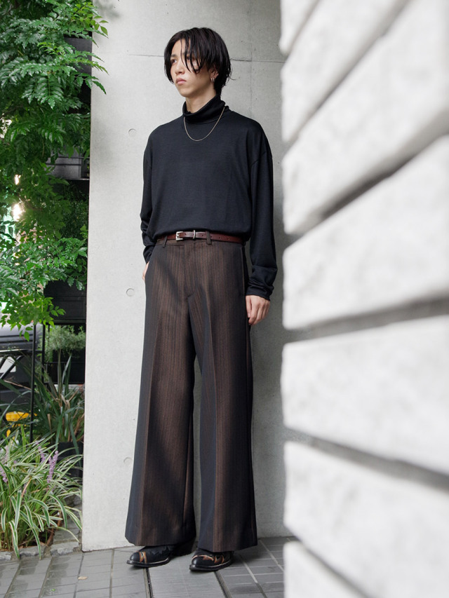 ノータック仕様である為、腰元は体に沿う着用感。裾にかけては体と衣服の空間が生まれ、写真でも伺えるAラインの美しさは、モードスタイルの頂点を行く完成度が非常に高いシルエットです。