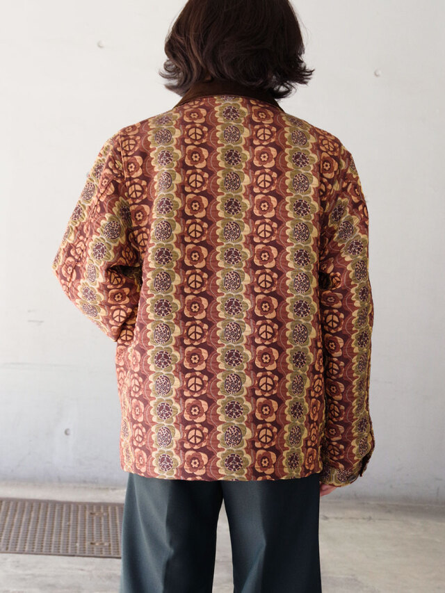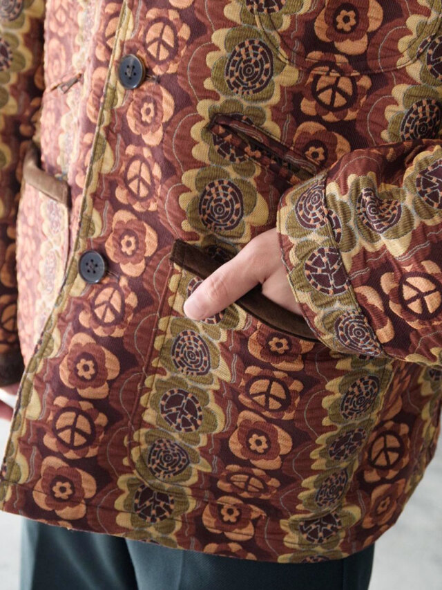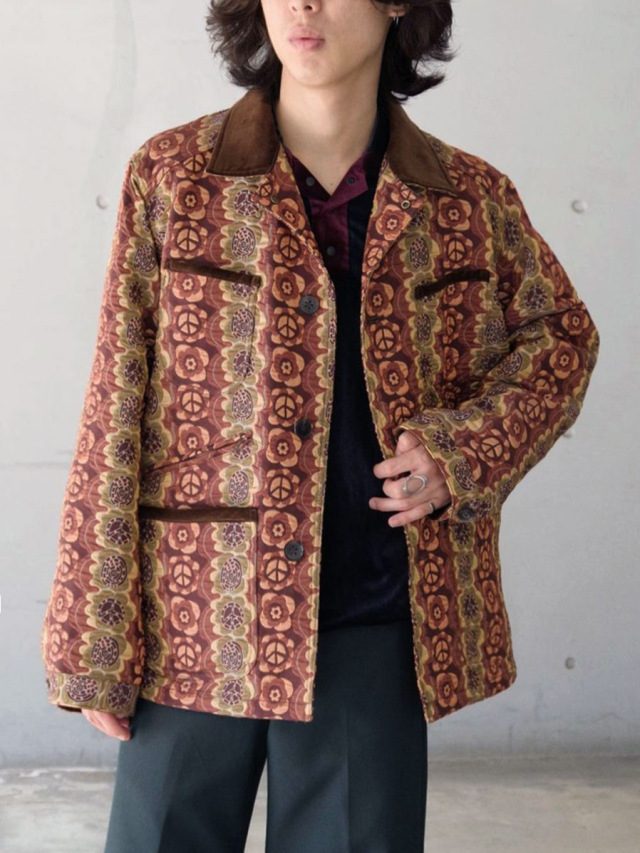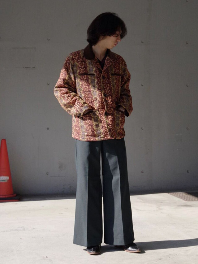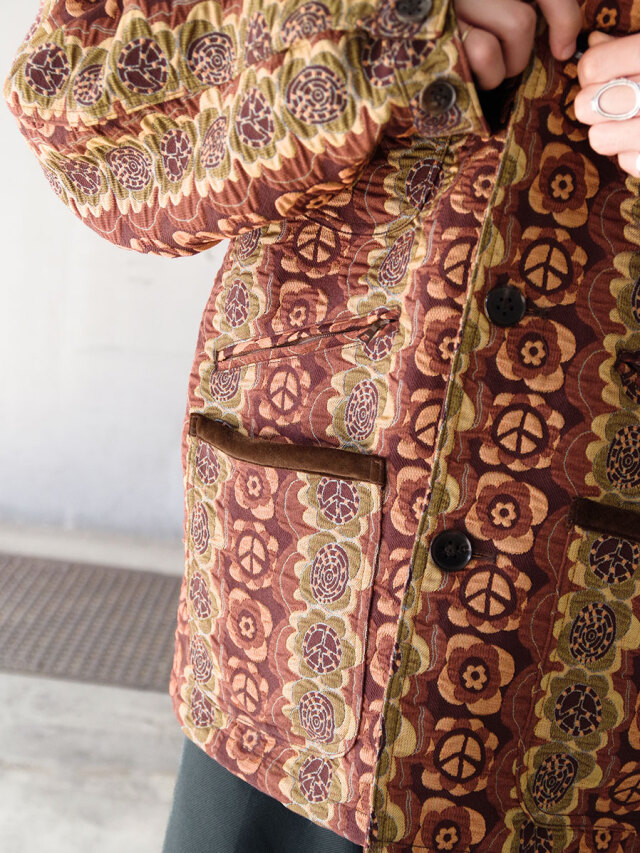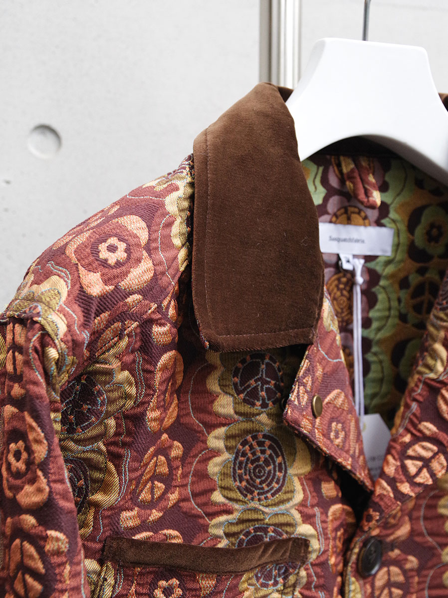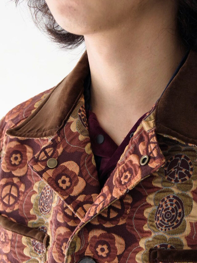 街でも一際目を引くデザイン性の高いテキスタイルと、それゆえにシンプルに位置付けたカバーオールとしてのフォルム。実用性の中に、ファッションを楽しむことを思い起こさせてくれる作品です。