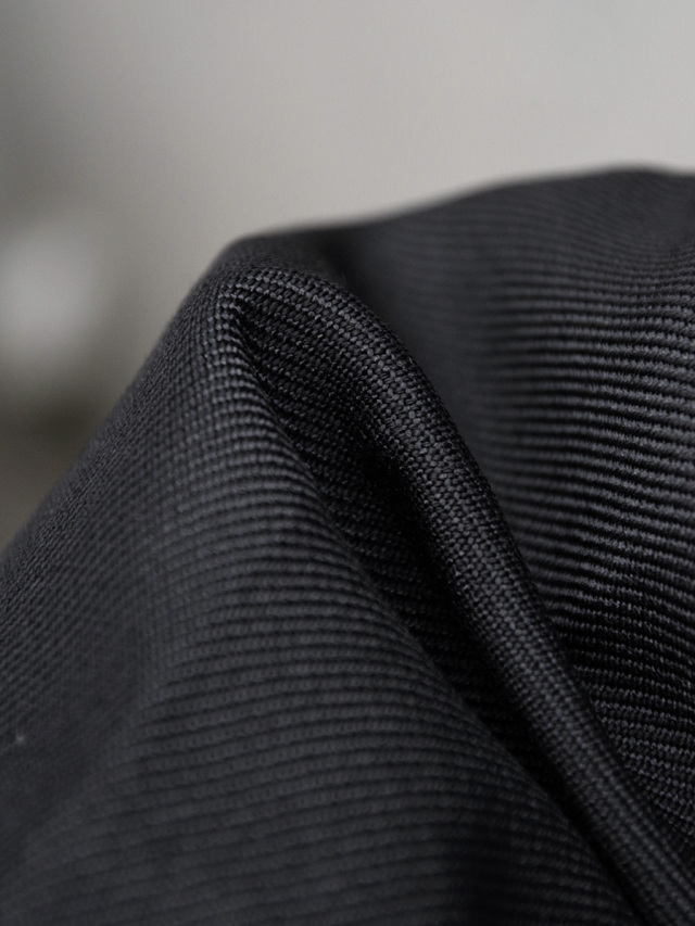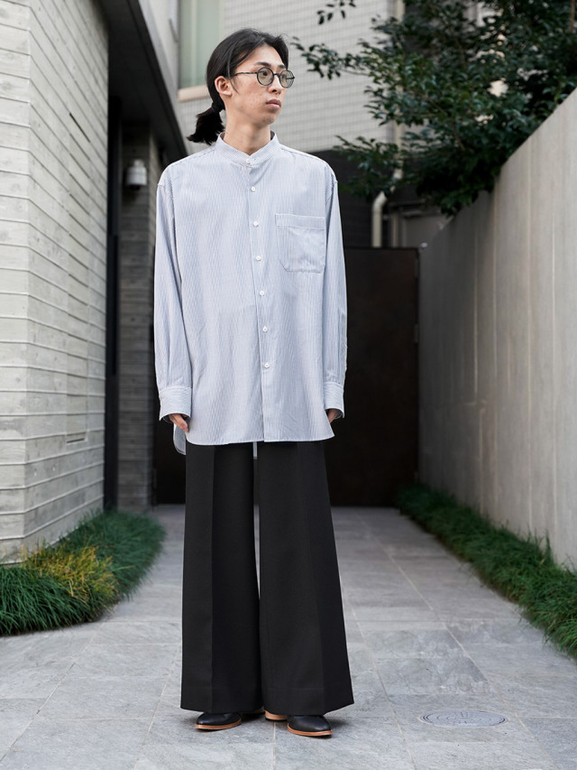 裾に生地分量が多い為、裾から全体に重さが伝わり、動作による生地が揺れ動く様は上品且つ凛とした表情。目で追うほど、しなやかなさのあるドレープに魅せられるものがあります。ボタンにはブランドオリジナルの五芒星ボタンを採用。細部に至るまで拘り抜かれた仕上がりです。