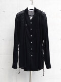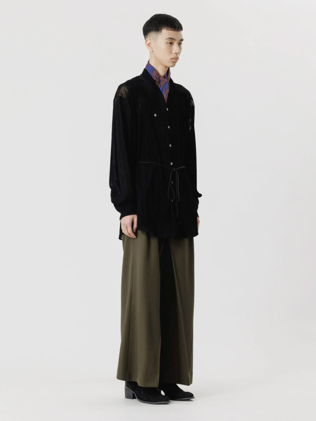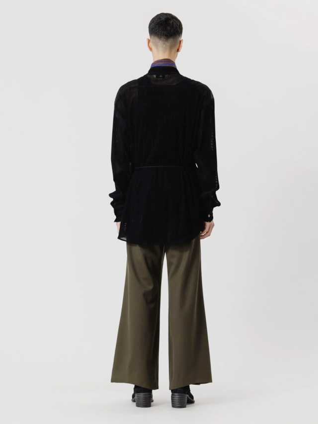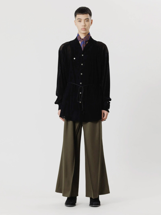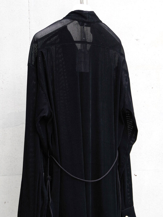 今季はメッシュ組織で構成されたベルベット素材を採用。横への伸縮性に富み、透け感ある表情はとても軽やかな印象を生みます。生地自体はとろみがありくったりとしていて、美しい縦への落ち感が特徴的。インナーとしての活用でも着膨れしません。