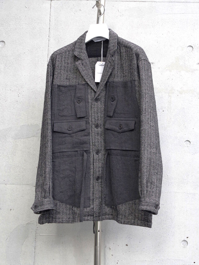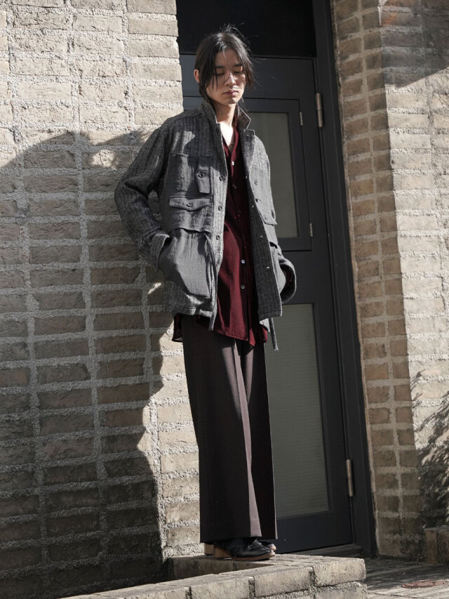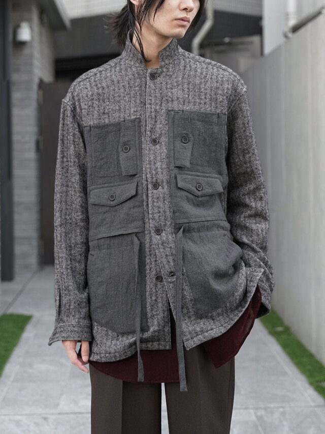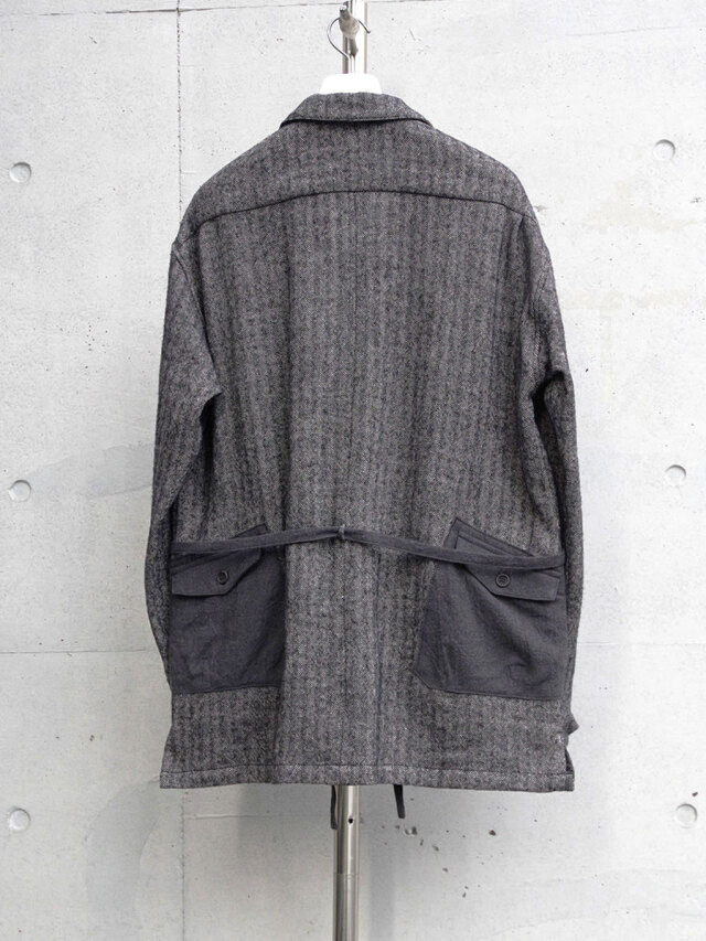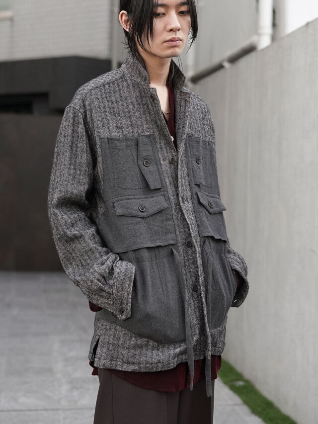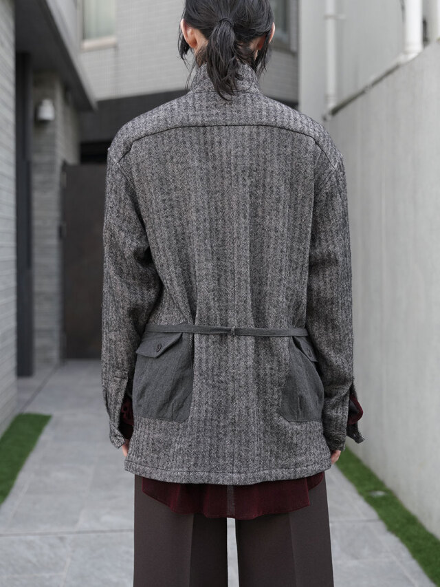 生地にはリネンウールヘリンボーンを採用し、天然素材の持つ温かみが感じられる仕上がりに。どこかクラシカルな印象を備えた生地感に、ギミカルなポケットのデザインを加えることでモダンな様相へアップデートされています。