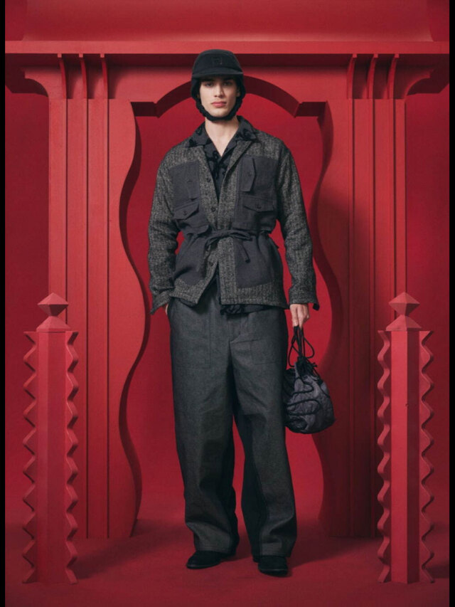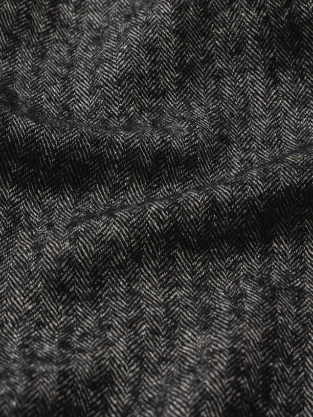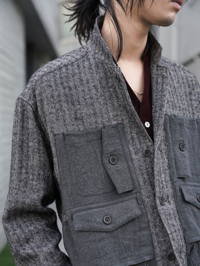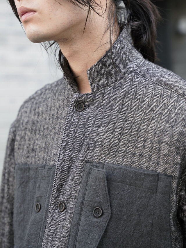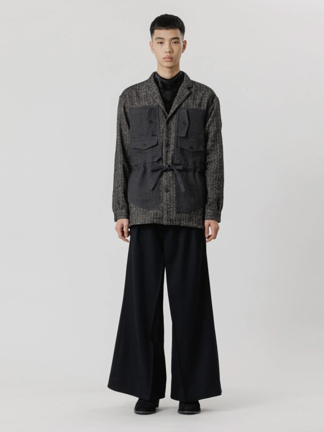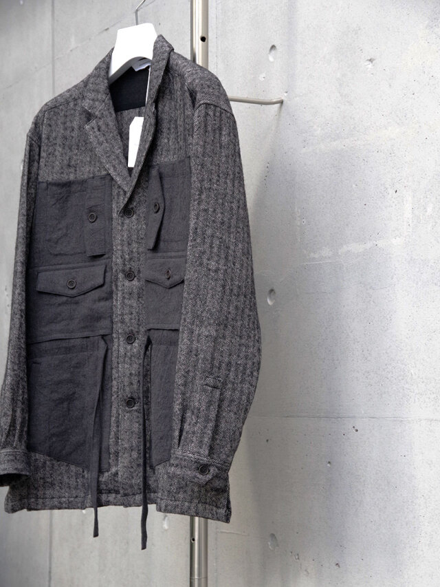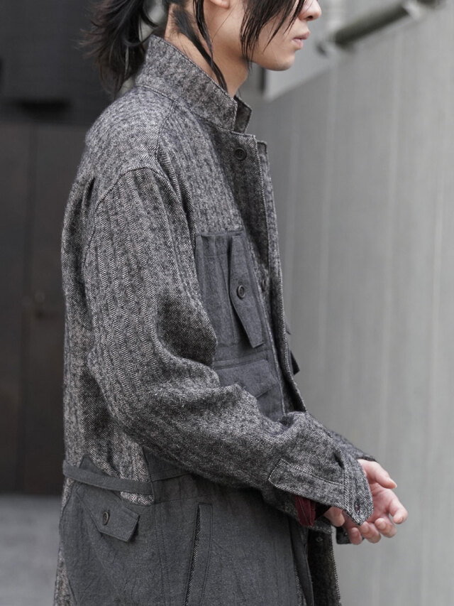 生地にはリネンウールヘリンボーンを採用し、天然素材の持つ温かみが感じられる仕上がりに。どこかクラシカルな印象を備えた生地感に、ギミカルなポケットのデザインを加えることでモダンな様相へアップデートされています。