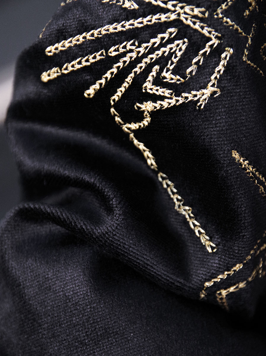 素材にはコットンパイルで構成された別珍素材を採用し、鈍く美しい光沢が特徴的です。刺繍は単色使いにすることで、嫌味のない洗練された印象に。直線で描かれたグラフィックはクラフト感を感じさせ、どこか温かみのある表情となっています。