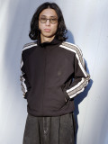 艶感を感じさせるストレッチ素材でアームにはブランドらしいレーステープが配置されたトラックジャケット。