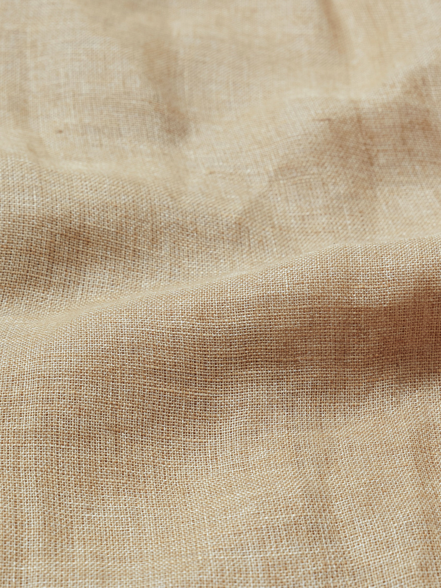 糸の持つ色合いや太さが均一でなく、天然繊維の表情が見事に表現された立体感のある生地が存在感を放ちます。触り心地は滑らかでしなやか、そして品のある微光沢を備え、リネンの粗野な印象を全く感じさせないmade in Italyらしいテキスタイルセンスが伺えます。