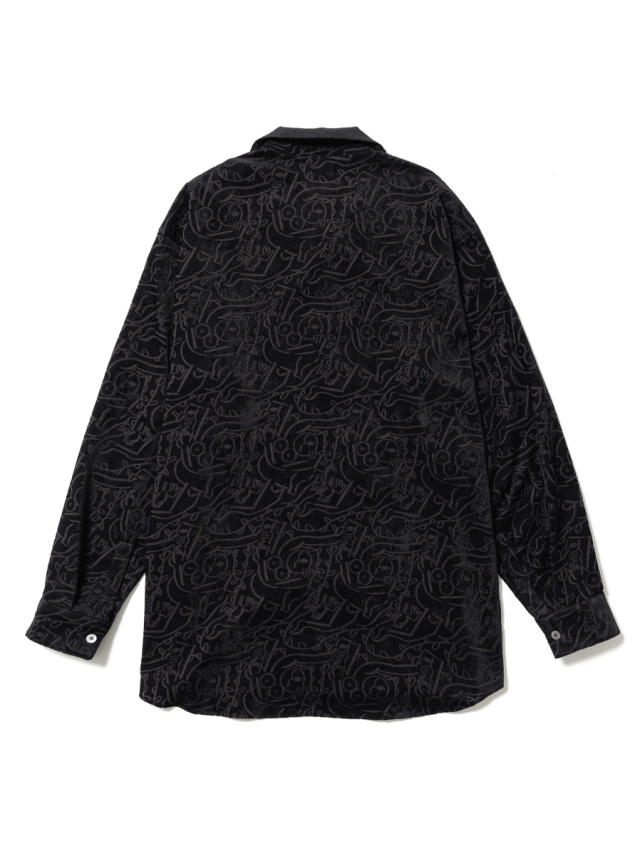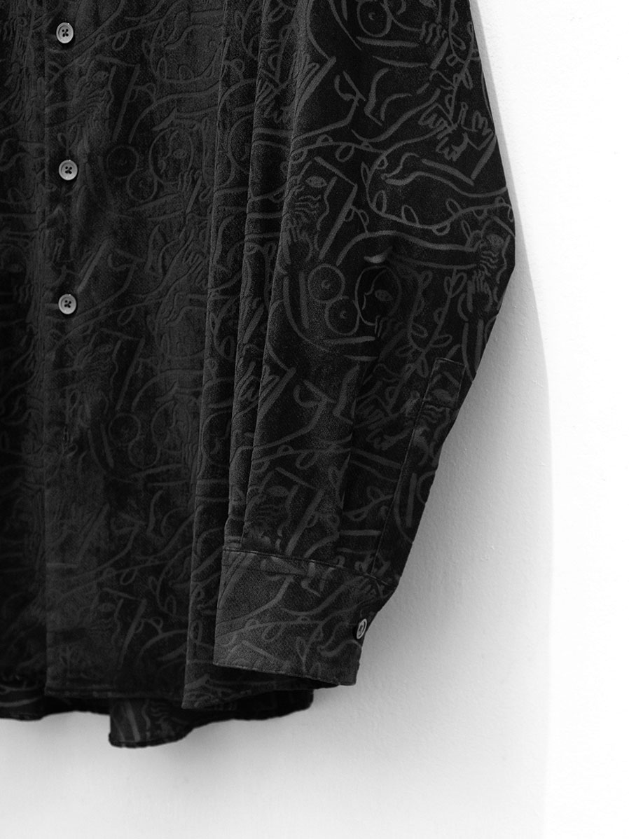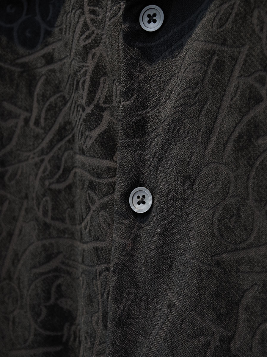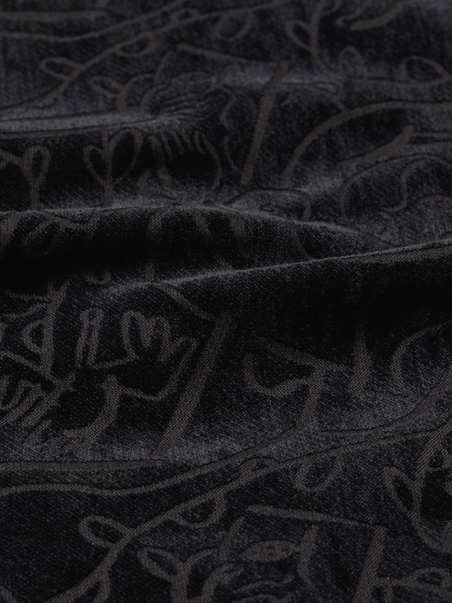 素材には、ベース糸とその上に起毛するパイル糸をそれぞれ別の色で染め分けたブランドオリジナルのシャンブレーベルベットを採用。さらに特定の箇所のみを炭化させるオパール加工を施すことで複雑なグラフィックが表現されています。