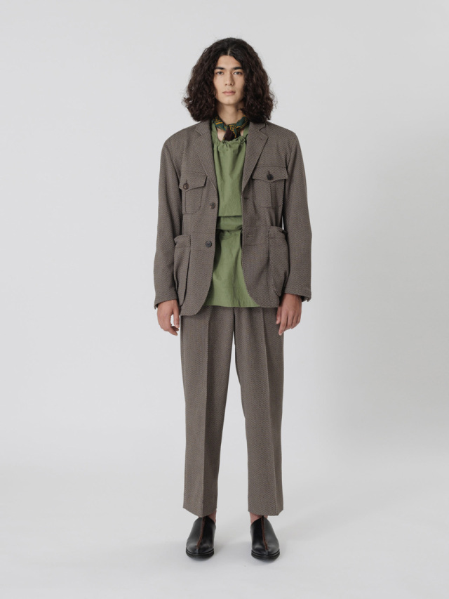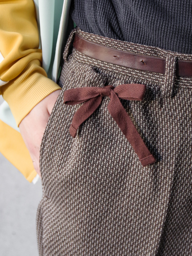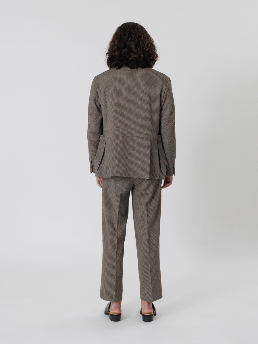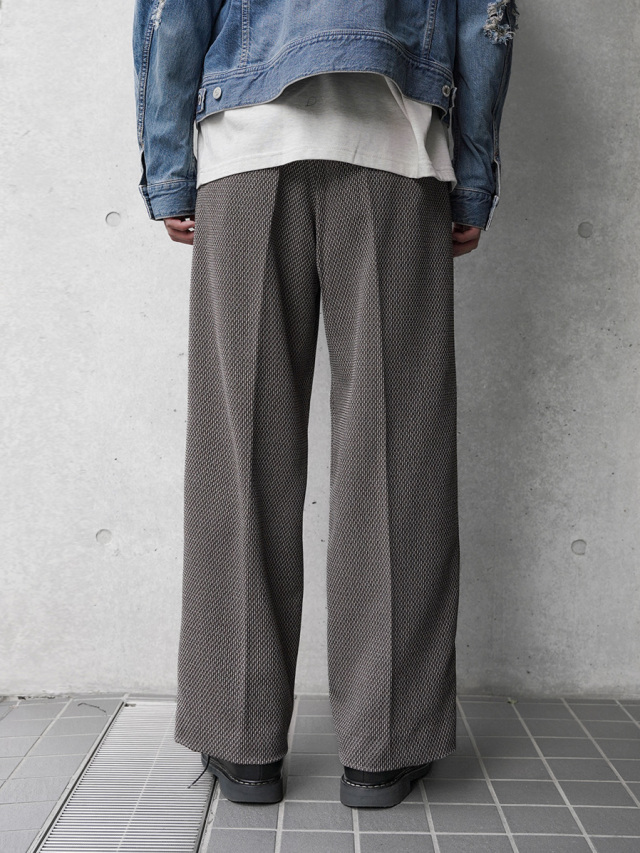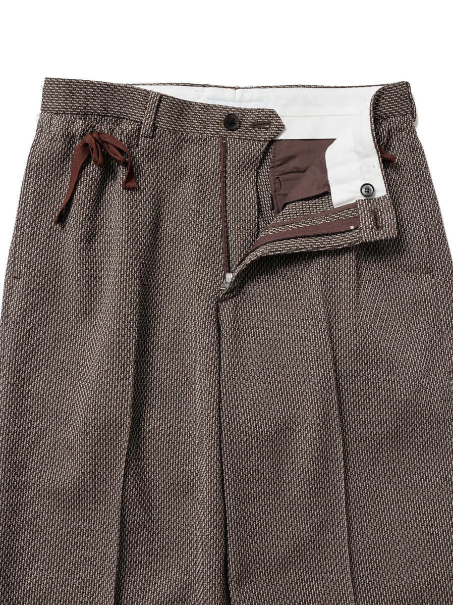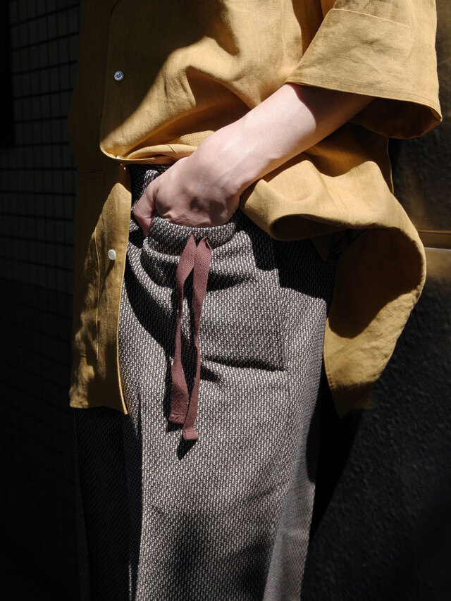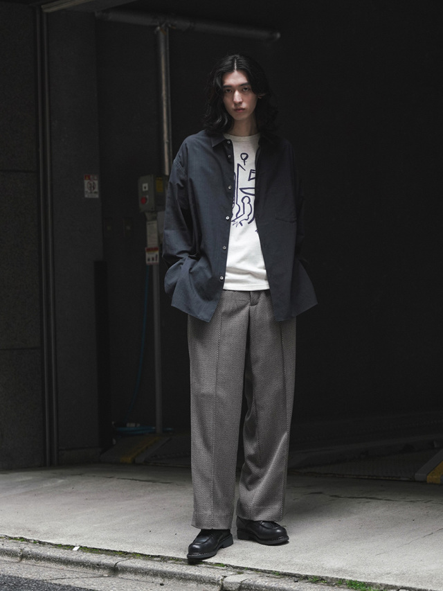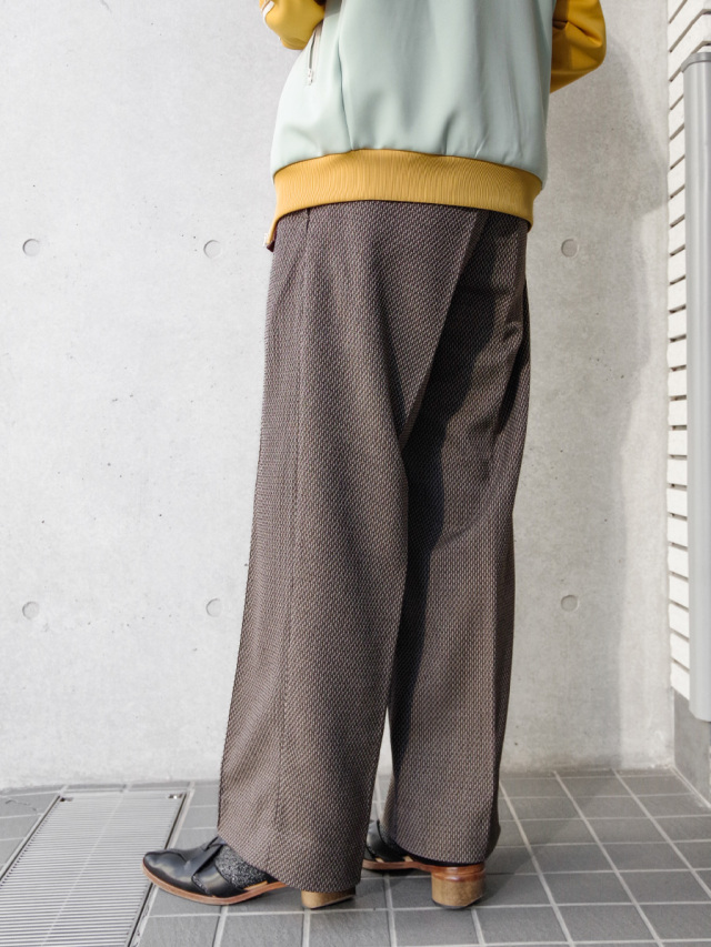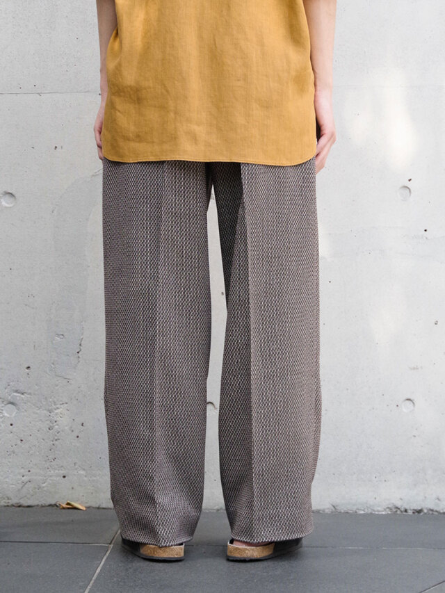 ワイドストレートのラインが非常に美しいスラックス。Polyesterのイージーケア性、Rayonのしなやかなドレープ性、Linenのような表情、Woolのような膨らみという4種類の素材のそれぞれの長所を併せ持ったツイードテキスタイルを採用。