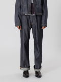13ozのリジッドデニムで製作され、腰元に1タックを設けることで立体感のある筒状のシルエットが形成されています。