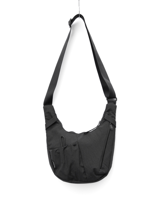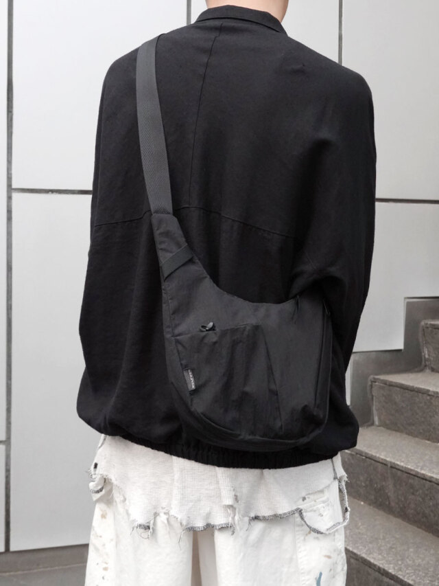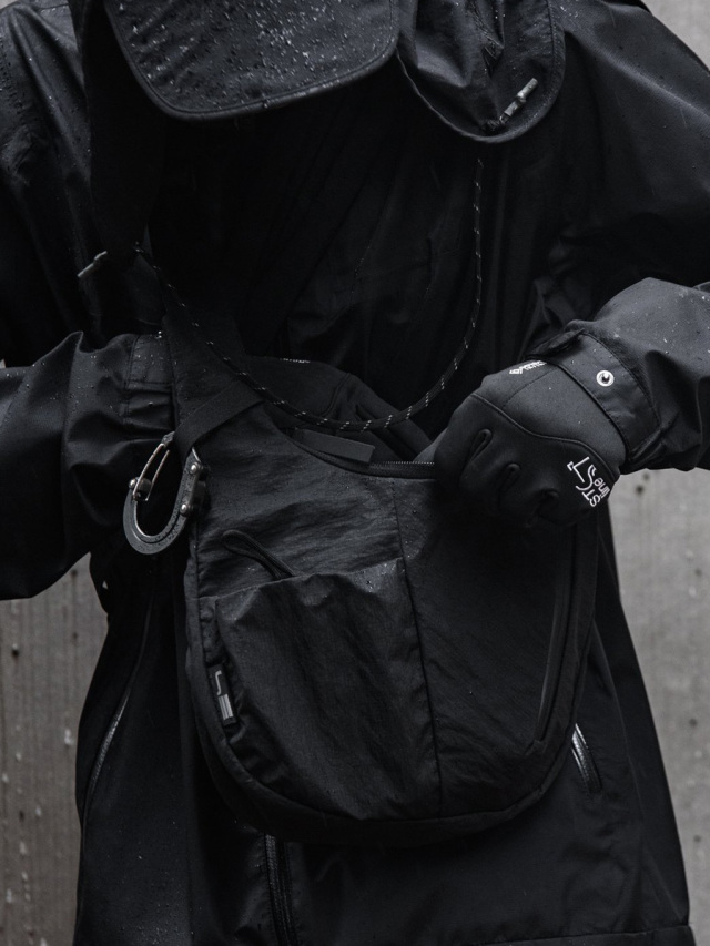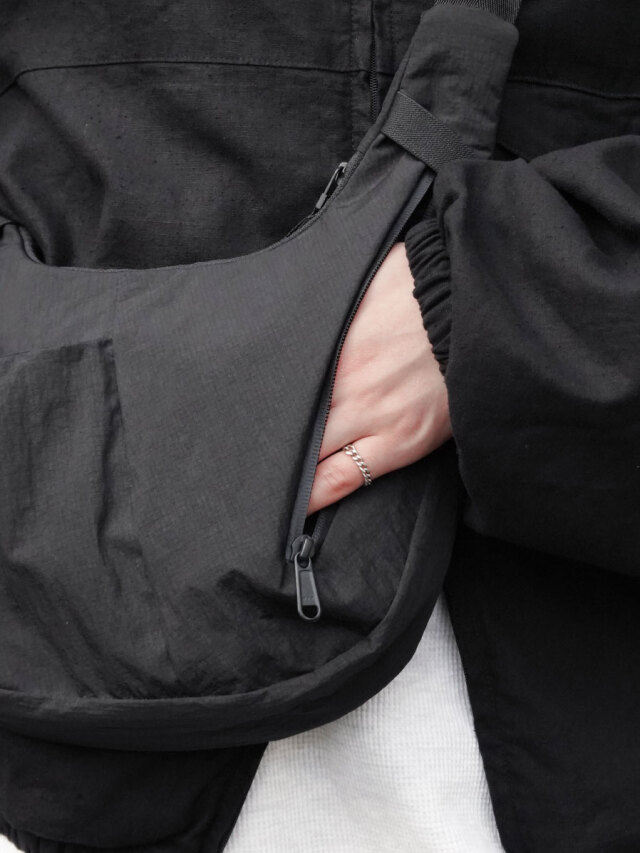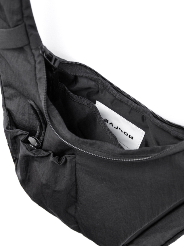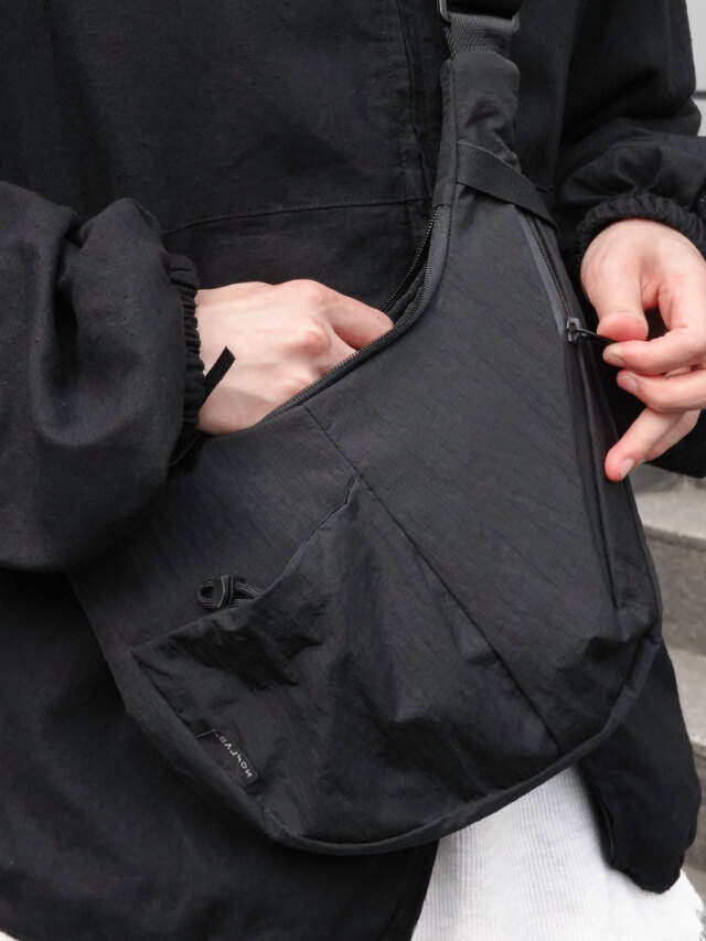 Model M1 is a crossbody bag with a crescent-shaped silhouette inspired by nature and ergonomics. The surface is made of high-performance ECOYA nylon with a water pressure resistance of 3000 mm, giving it a waterproof finish. The back is made of 200D nylon, which is also highly abrasion-resistant.