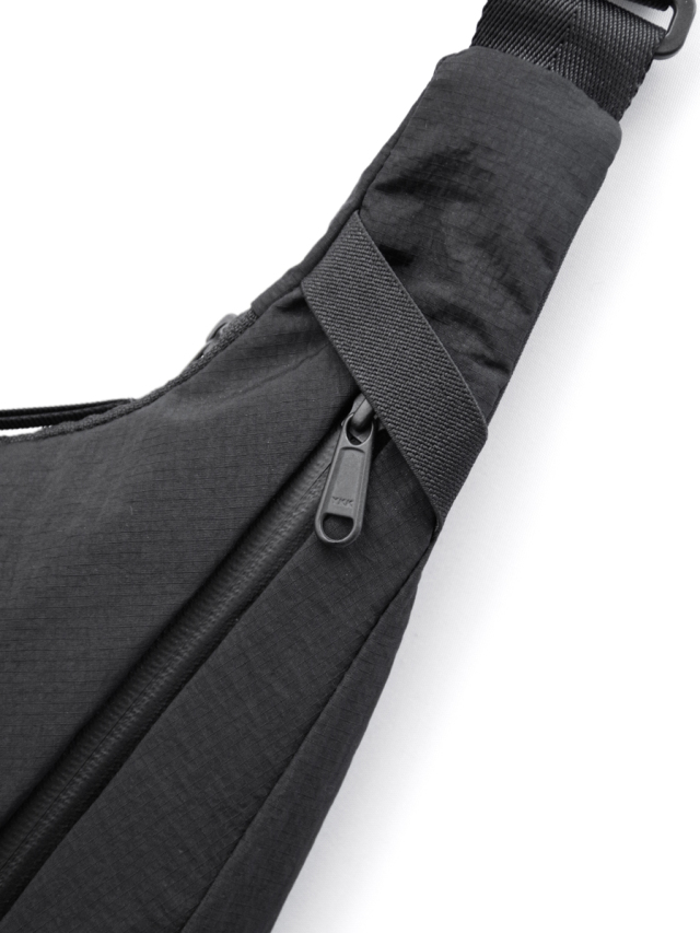 モデル M1は、自然と人間工学からインスピレーションを得た三日月型のシルエットが特徴のクロスボディバッグ。素材には表面に耐水圧3000mmの高機能素材ECOYAナイロンを採用し、防水性を高めた仕上がりに。裏面には200Dナイロンを採用することで、耐摩耗性にも優れています。
