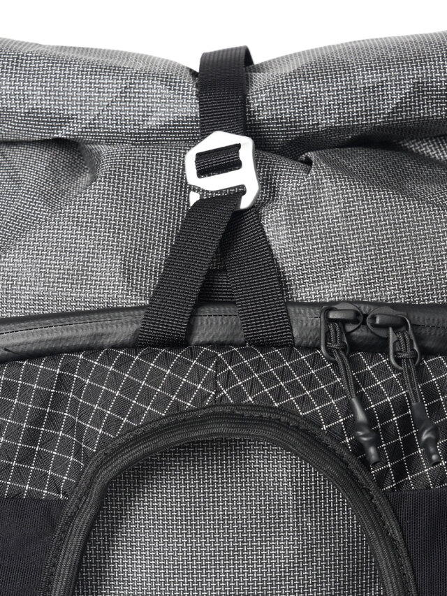 荷物の容量に応じてアレンジ可能なロールトップ式を採用しつつ、背面から前面をぐるりと囲むジッパーを搭載することで普段使いでも用いやすいように設計。一般的なULバックパックなどはメインコンパートメントへのアクセス経路が上部からのみという仕様が多い中で、使用者の利便性をとても良く考えられたデザインとなっています。
