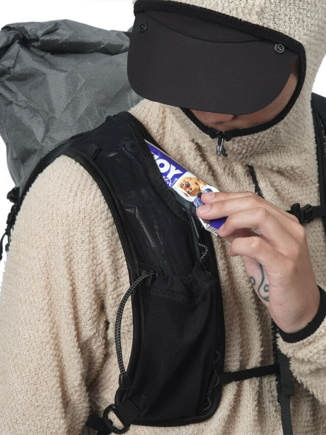 ポケットはフロント1箇所、両サイド2箇所に加え、背負った状態でもアクセス可能なボトム貫通式ポケット、ショルダーストラップのボトル収納ポケット2箇所、その上部に縦型収納ポケット2箇所の計8ポケットを搭載。