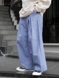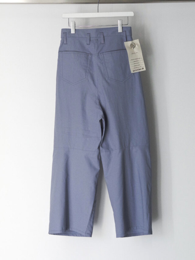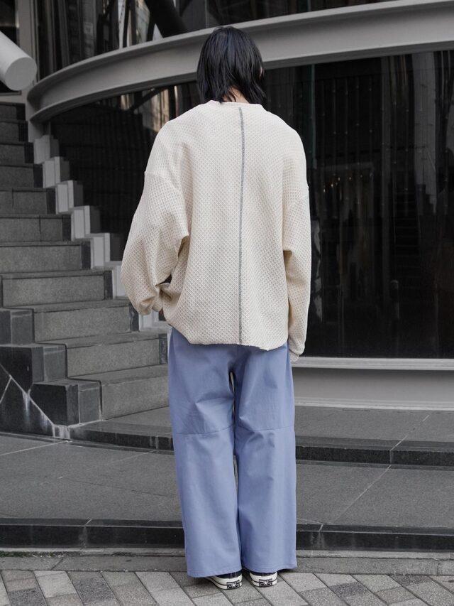 たっぷりと生地を取ることで筒状のボリュームが生まれ、前方向に重心を感じさせる構築的なシルエットを形成しています。ウエスト位置をやや高めに設定して着用することで、その立体的なラインがより一層際立ちます。