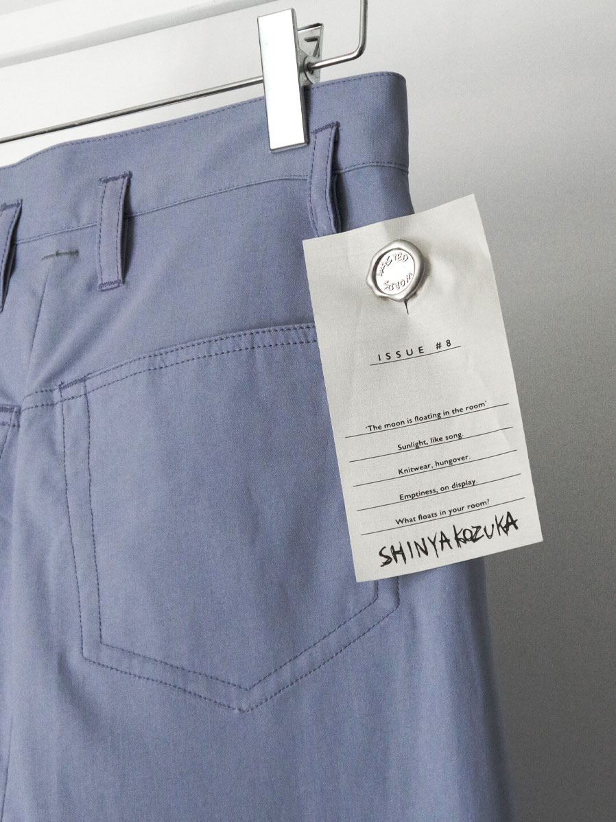 By using a generous amount of fabric, the pants form a cylindrical volume that creates a structured silhouette with a forward-weighted presence. Wearing them slightly higher at the waist further emphasizes the sculptural shape.
