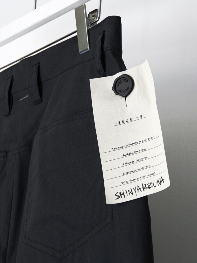 By using a generous amount of fabric, the pants form a cylindrical volume that creates a structured silhouette with a forward-weighted presence. Wearing them slightly higher at the waist further emphasizes the sculptural shape.