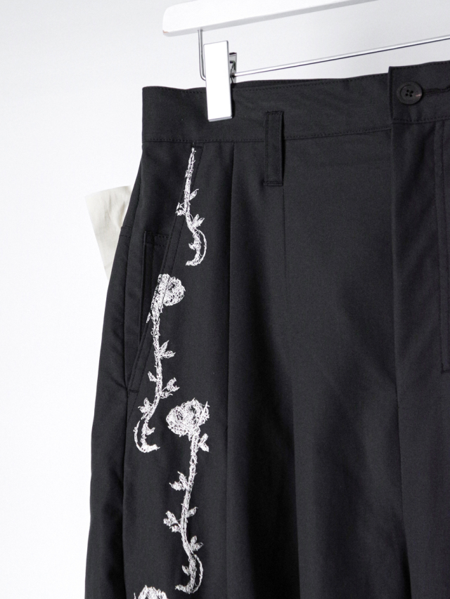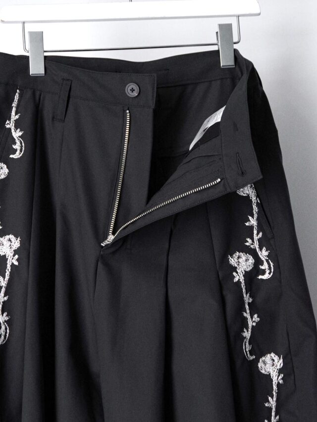 An embroidered motif combining a carnation and the moon, symbolic of the current season, adds a distinctive accent to the design. The pants also pair well with tucked-in styling, allowing the overall impression to shift depending on the balance with the top.