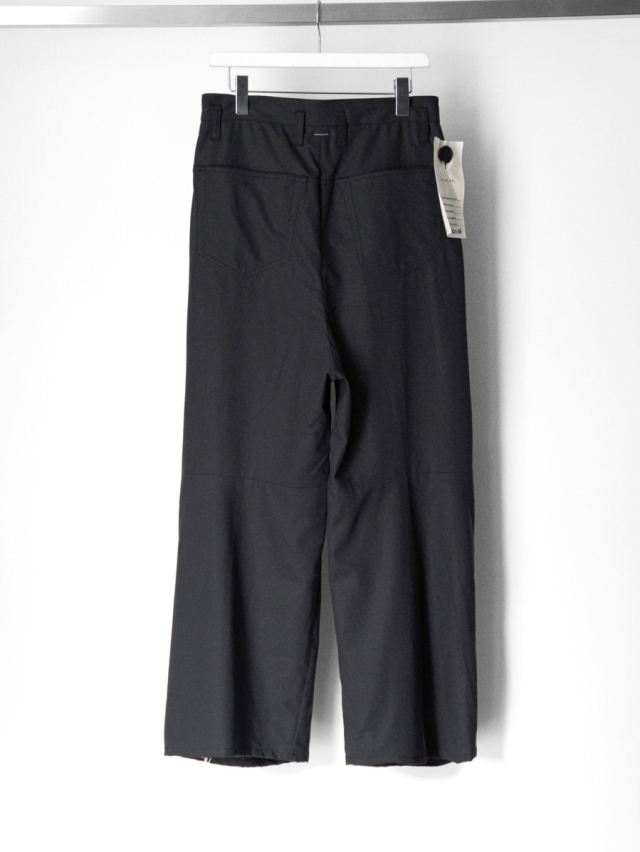 フロントには深めの2タックを施し、たっぷりと生地を使うことで筒状のボリュームを形成。前方に重心を感じさせる構築的なシルエットが特徴です。ウエスト位置をやや高めに設定して着用することで、その立体的なラインがより際立ちます。