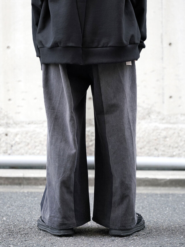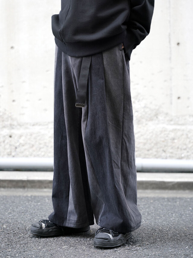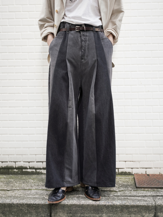 通常膝まわりにとられていたダーツを排除することにより、今季のHOME BAGGYにも通ずるワイドストレートシルエットを表現。巧みなパターンメイキングからなる立体感あるシルエットとなっています。