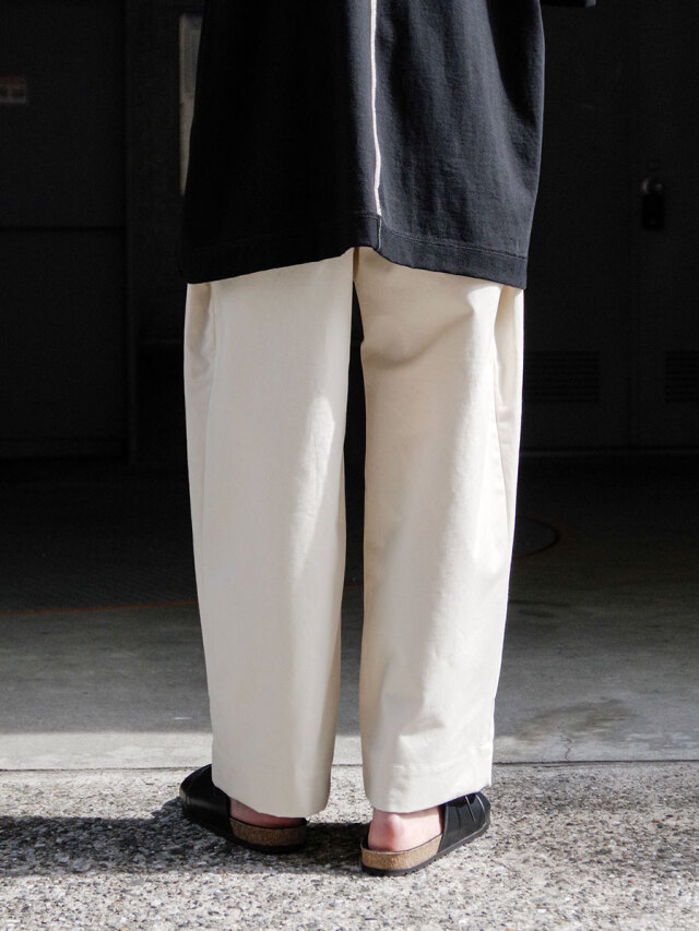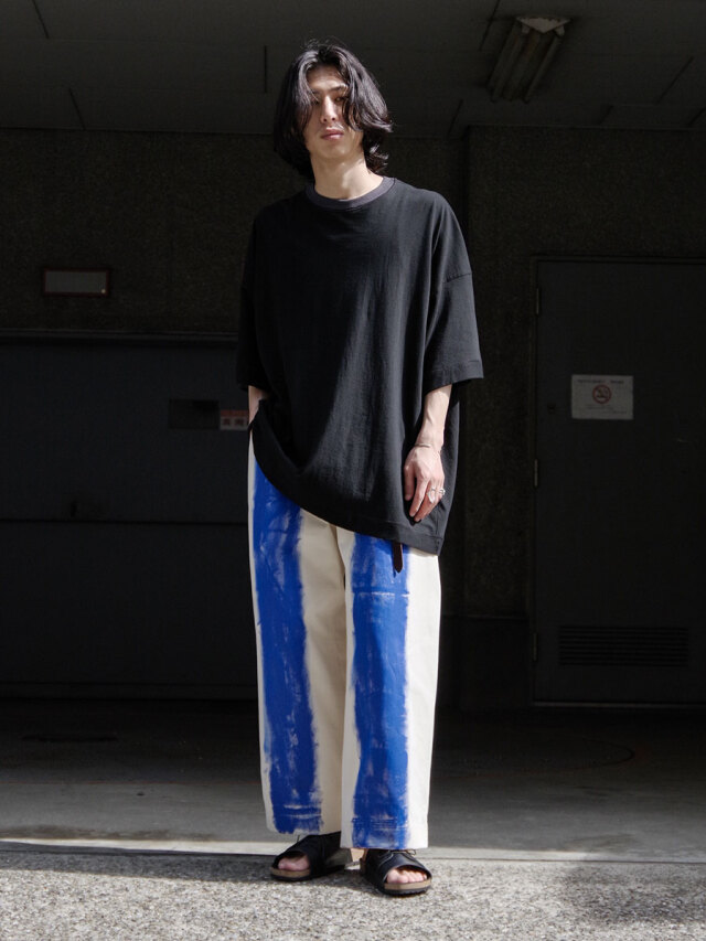 シルエットはワイドストレートに少しテーパーをきかせ、しっかりとワイド感は残しつつも太すぎないという絶妙な仕上がりです。SHINYAKOZUKAのBAGGYパンツよりもすっきりとしたデザインなので、クセがなく何にでも合わせやすいデザインです。