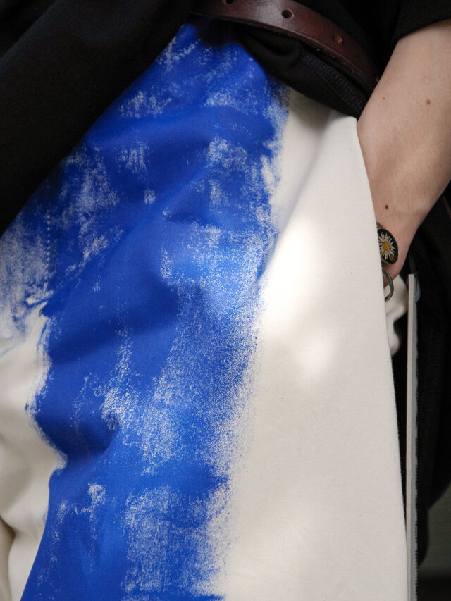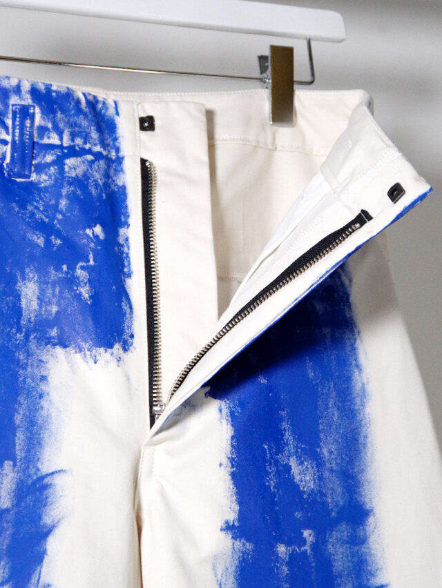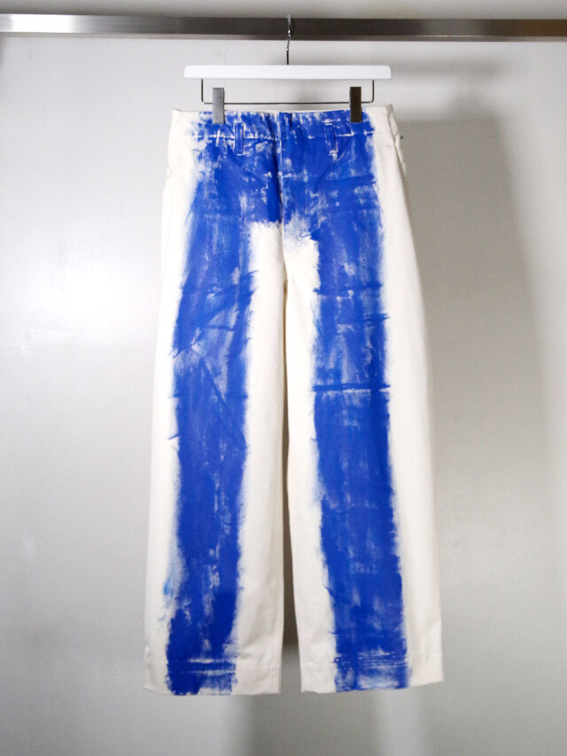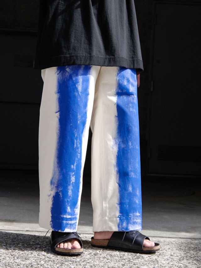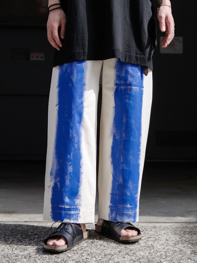 フロントには職人によりペイント加工が施され、一点モノの作品として昇華されたデザインに。単調になりがちな春夏の装いにボトムスで主張あるコーディネートを楽しませてくれるアイテムです。