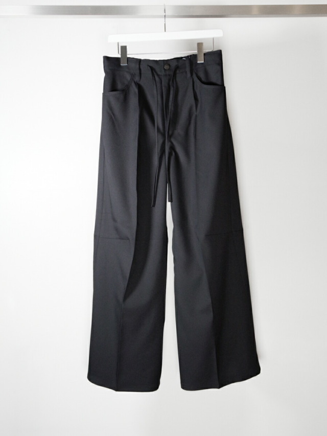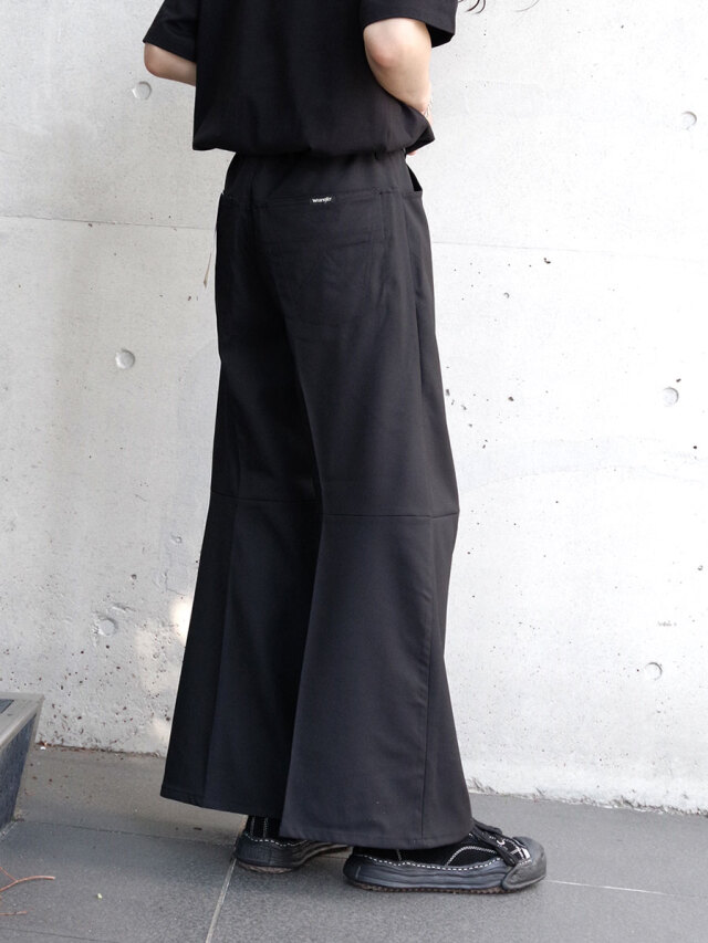 シルエットは美しいパターンメイクで立体的に仕上げられたワイドフレアシルエット。スリーピングウェアを意識し、ウエストにはドローコードが通されイージー仕様に。