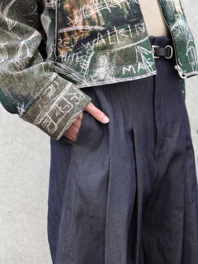 デッドストックのテキスタイルを用いて製作されたシリーズからSHINYAKOZUKAの代名詞ともいえるバギーパンツが登場。