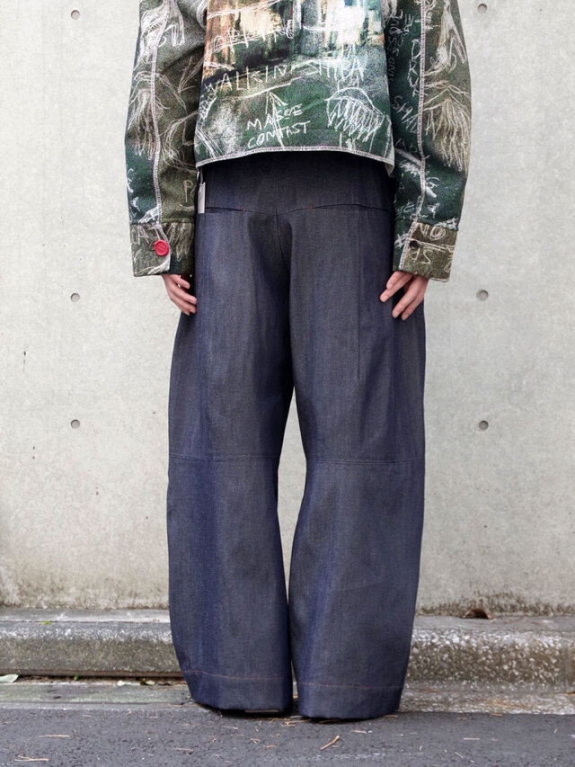今作ではソフトな風合いで光沢が特徴のテンセルをベースに製作されたデニム生地を採用。柔らかくとろみのある生地で、本来イメージとしてあるハリがありワークっぽさを感じさせるデニムの概念を覆しています。意外性が高く、履き心地は軽やか。形と相まってストレスなく履いていただけます。