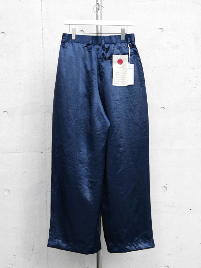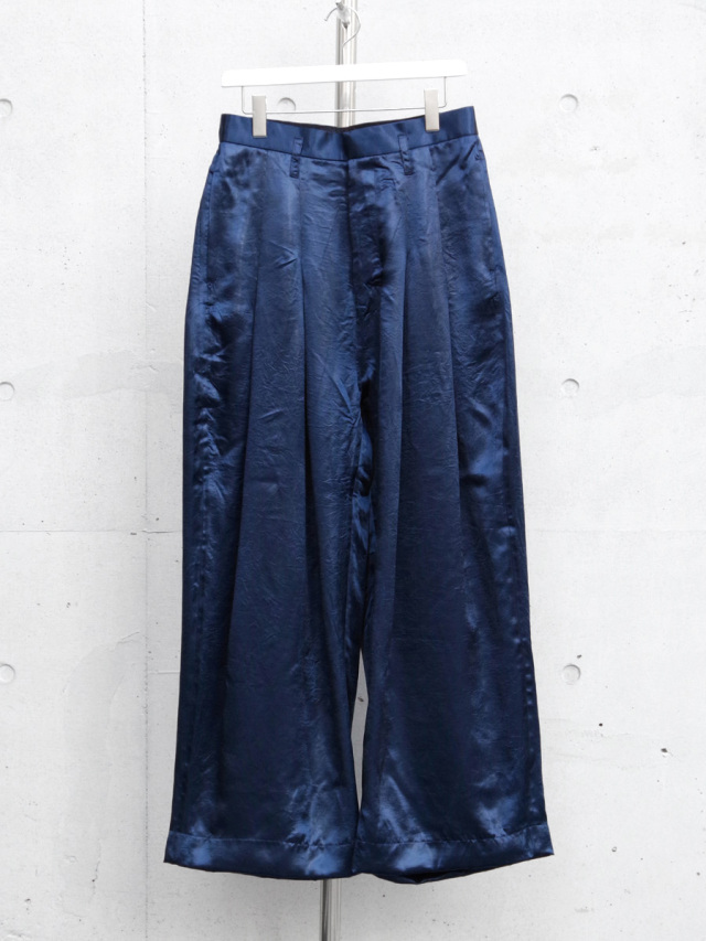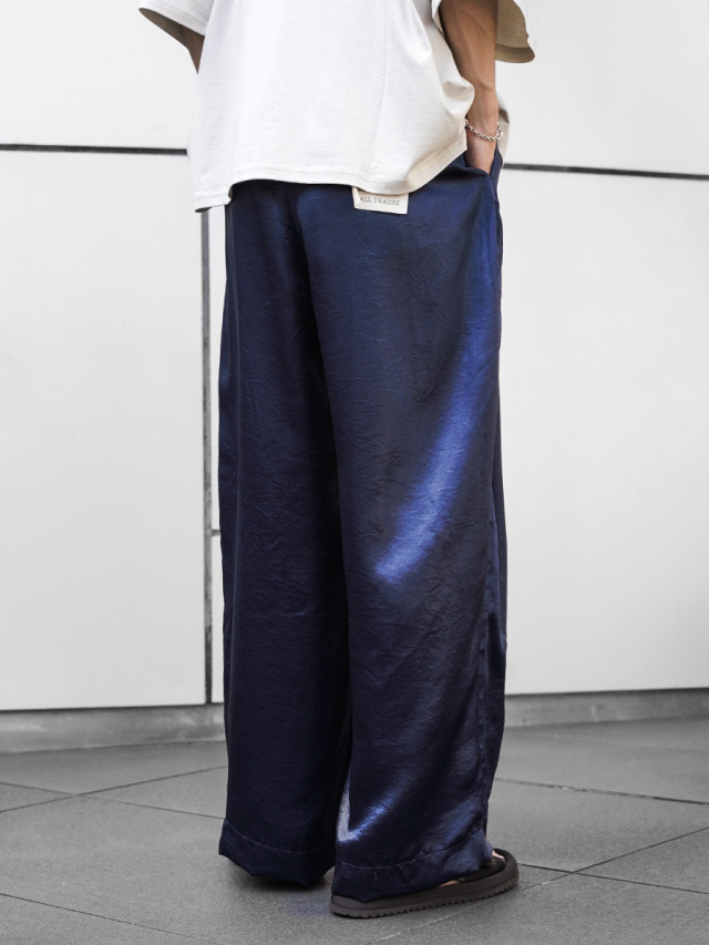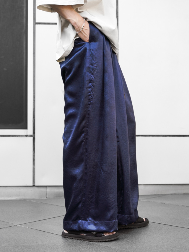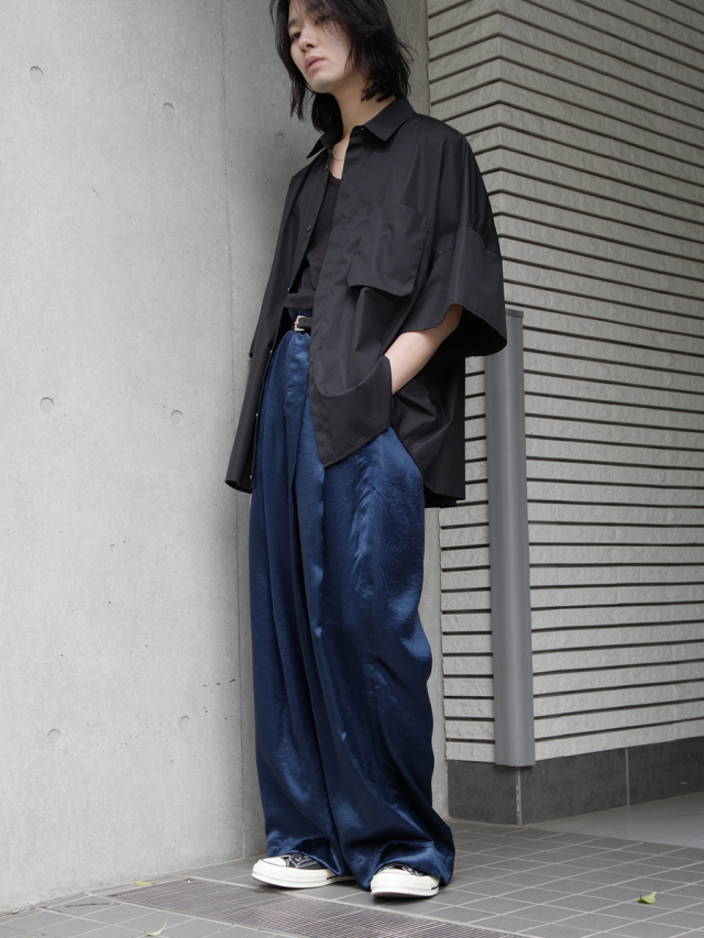 生地は光沢感とシワ感を出す特殊な加工を施したアセテートサテンを使用。アセテート素材本来の特徴であるとろみのあるドレープを最大限に引き出すよう、品のある Dear,BAGGY に落とし込まれています。また、吸湿性やシワになりづらい点も特徴な素材。そこにあえて加工を加え、綺麗になりすぎないバランスで、クラッシュ感のある退廃的な雰囲気もプラスされています。
