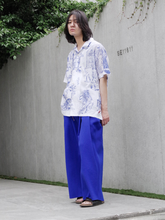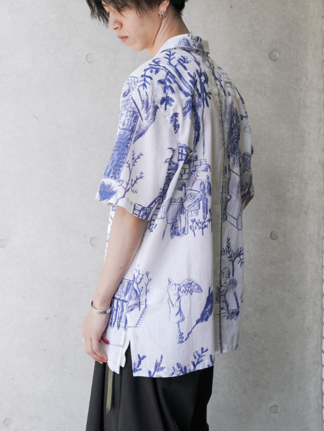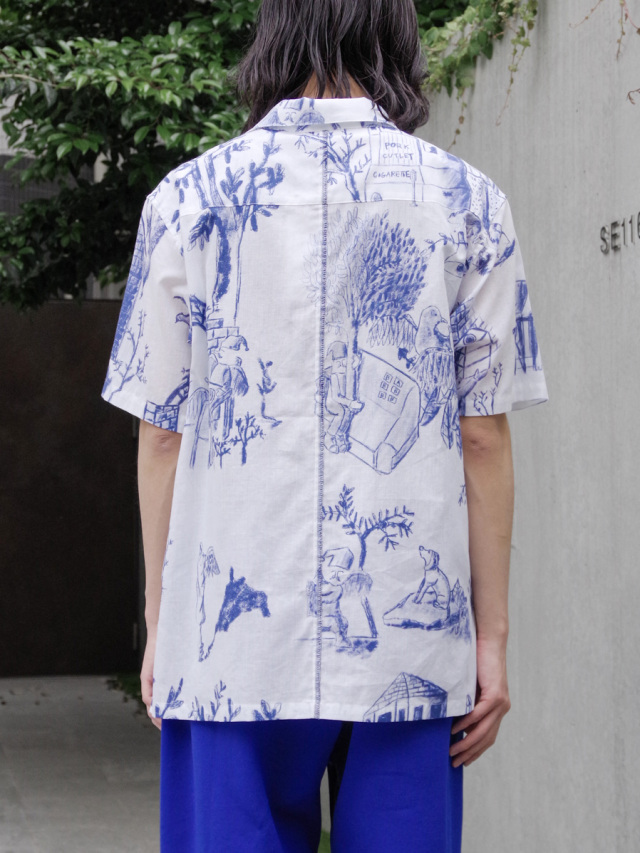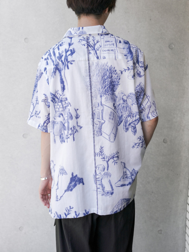 施されたグラフィックは、デザイナーが思い描いた情景を自ら絵に描き起こしたもの。シングルガーゼ特有のエアリーで柔らかな素材感が特徴の一品です。