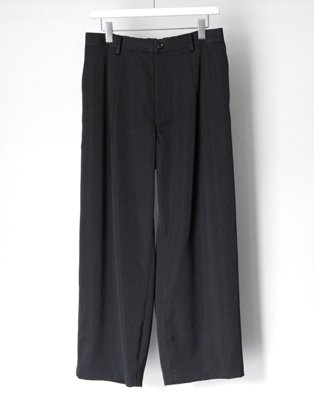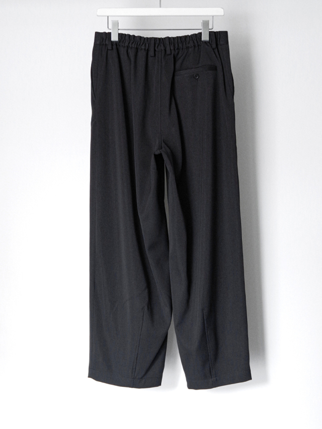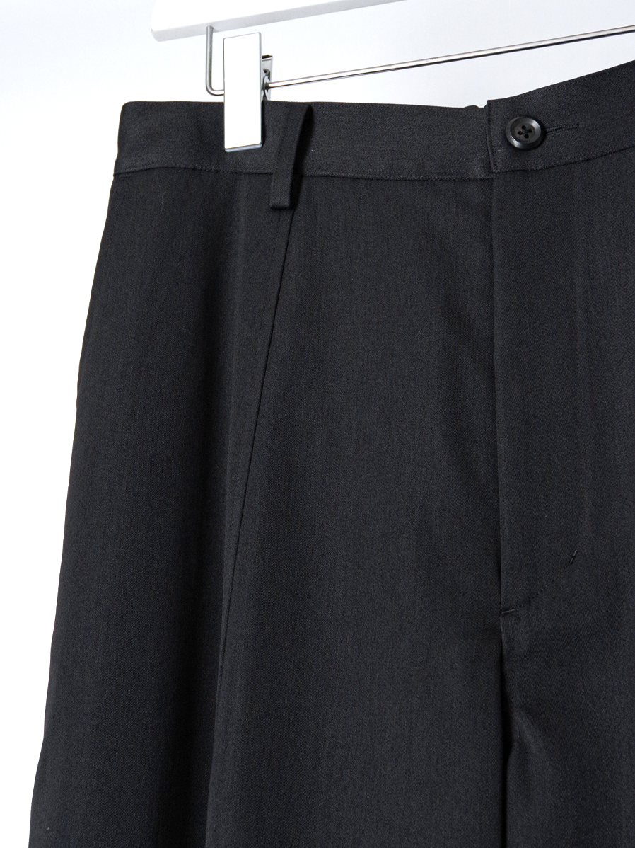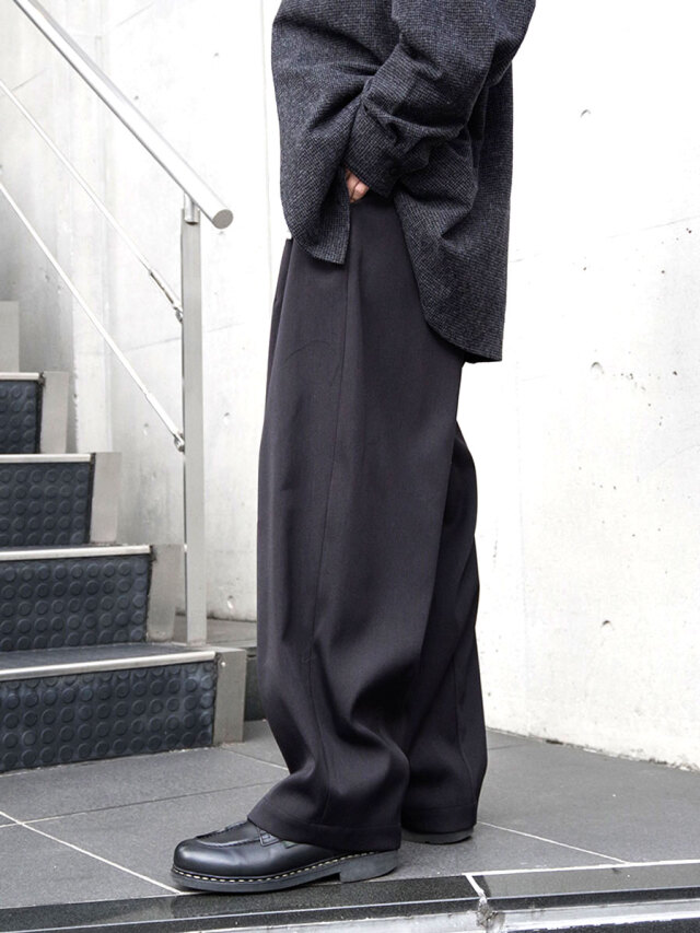 The silhouette is a semi-wide tapered cut designed to enhance the natural line of the legs. Darts at the waist control fullness for a sharp upper silhouette, while darts at the hem create a neat taper, achieving a sophisticated, tailored look.